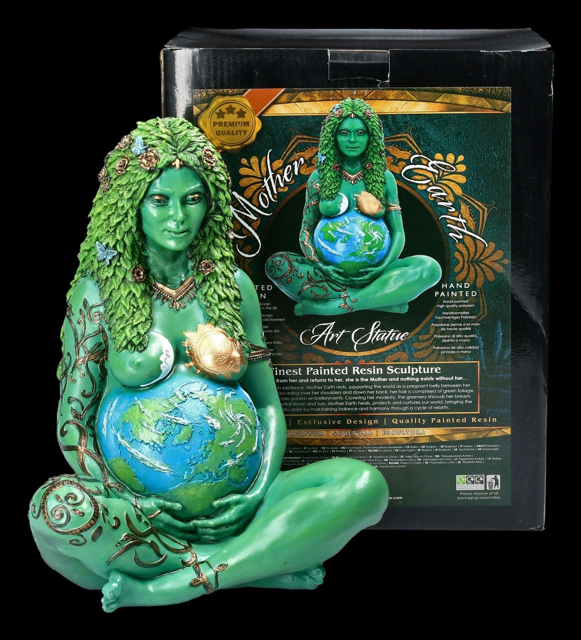 Mutter Erde – schützend umfasst die in sanften Grün- und Blautönen handbemalte himmlische Gaia ihren Bauch kurz vor der Geburt der Erde. Ihr Blick ist sanft und nachdenklich. Mit ihren glänzenden Tatoos und dem edel ausgearbeiteten Schmuck in den langen Haaren und mit den detailliert herausgearbeiteten grünen Blättern und langem Zopf, ist die Gaia Figur ein sehr schönes Geschenk für die Schwester oder Freundin und wird in einer Geschenk-Box versandt. Diese Gaia-Figur ist 29,0 cm hoch, 23,0 cm breit und 21,0 cm tief und aus detailreich handbemaltem Kunststein (Polyresin).