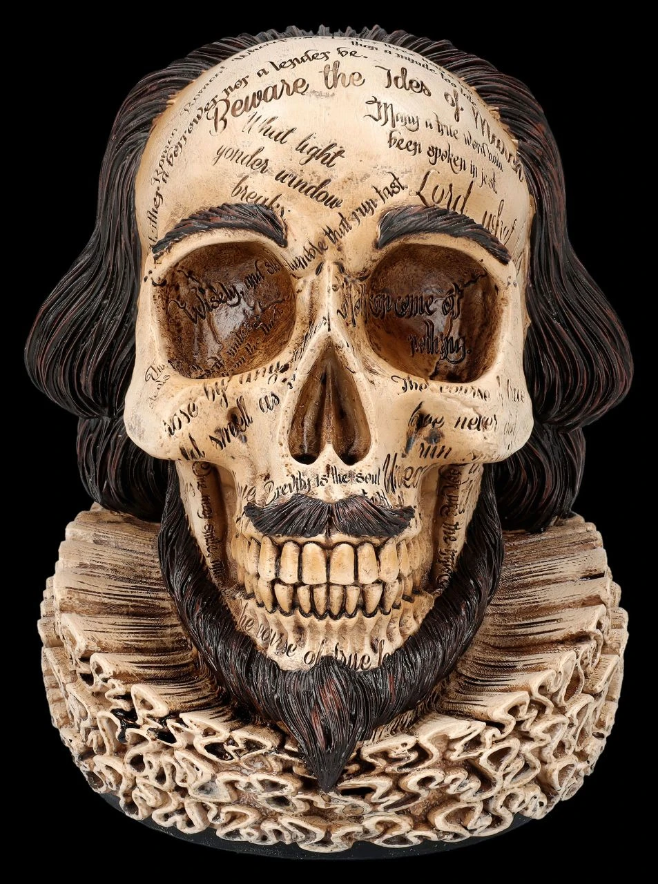 Wenn dieses Meisterwerk nicht die perfekte Dekoration in einem Bücherregal oder auch für ein Theater oder für einen Bücherladen ist! Shakespear’s Vermächtnis in Zitaten auf diesem realistischen und daher wirklich schaurigen Schädel des großen Dichters ist einfach fantastisch. Selbst Bart, Frisur und Halskrause erinnern an die Bilder, die man kennt. Die 14 cm hohe, 12 cm breite und 15 cm tiefe Totenkopf-Figur von Nemesis Now ist sehr detailreich aus hochwertigem Kunststein (Polyresin) entstanden und wurde mit Liebe zum Detail von Hand bemalt. Shakespear’s Legacy ist auch ein perfektes Geschenk für alle, die von den Werken des großen Dichters immer noch fasziniert sind.