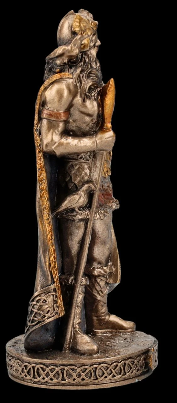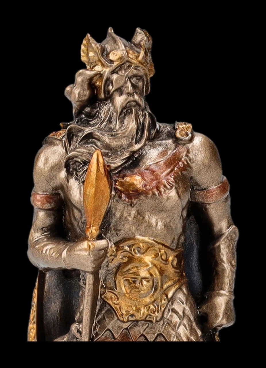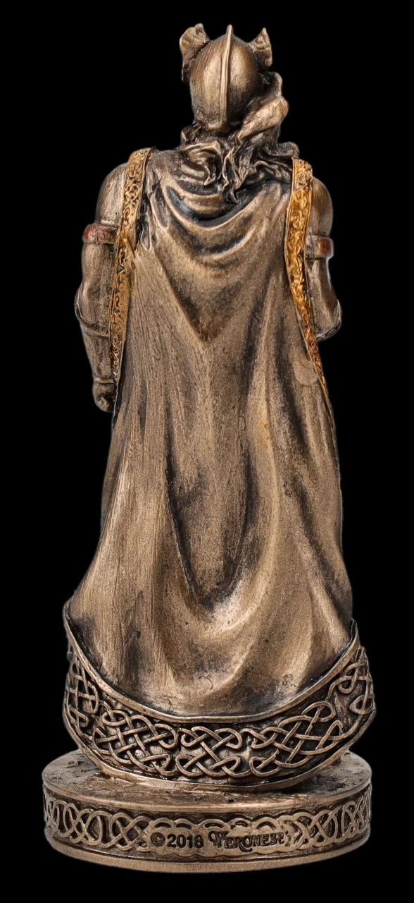 Odin war nicht nur der höchste Gott der kriegerischen Asen, er war der nordische Hauptgott überhaupt und steht für die Weisheit, die Runen und die Magie, aber auch für den Krieg und die Toten. Um aus dem Brunnen des Wissens trinken zu können, hatte er einst ein Auge geopfert. Die kleine Figur des Gottes Odin steht mit königlichem Umhang, Helm und Speer herrisch auf dem mit seinem Namen beschrifteten Podest. Die wunderbar detailreiche, edel bronzierte und sehr fein colorierte Figur aus Kunststein (Polyresin) stammt aus der Studio Collection von Veronese. Sie ist 8,5 cm hoch, 4 cm breit und 3,5 cm tief und – vielleicht gemeisam mit den anderen Götterfiguren aus unserem Shop – ein perfektes Geschenk für alle, die von der nordischen Mythologie fasziniert sind.