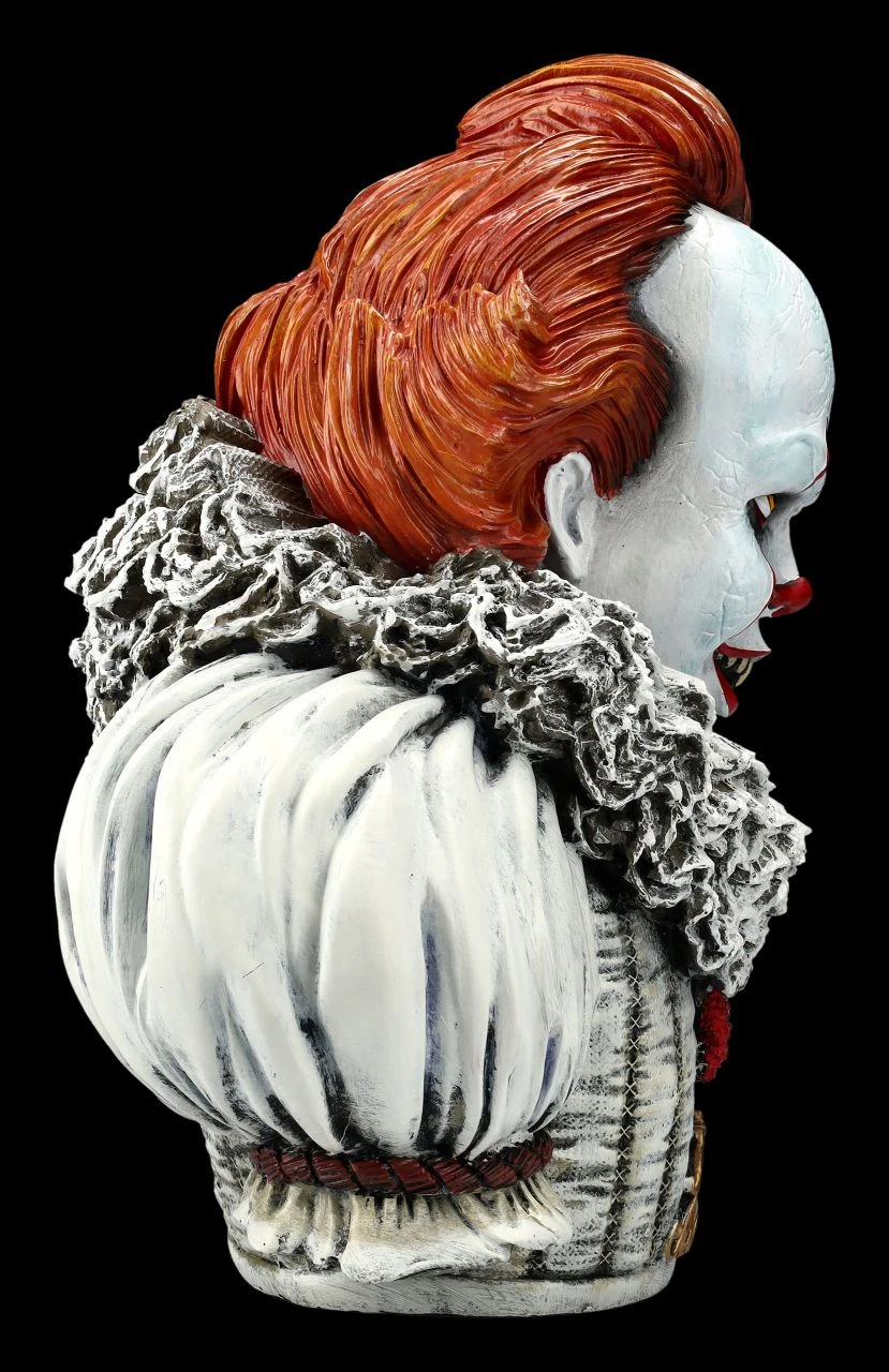 Wunderbar realistisch ist diese Büste von Pennywise, dem schrecklichen Horror-Clown aus Stephen King Film ‚ES‘ ausgefallen. Die 30 cm hohe, 26 cm breite und 17 cm tiefe Büste wurde aus hochwertigem Kunststein (Polyresin) gefertigt und sorgfältig von Hand bemalt. Pennywise, das aus einer Parallewelt, dem sogenannten Makroversum stammende uralte kosmische Wesen, krabbelt als Gestaltwandler alle paar Jahre aus den Abwasserkanälen von Derry, wo er einst als Meteorit abgestürzt ist. Grinsend wie ein Irrer tötet und frisst der Killer Clown unvorsichtige Kinder aus Derry. Diese fantastische Büste zeigt den Horror Clown in all seiner Pracht, wie er nach vorne gebeugt mit fiesem Grinsen den Betrachter anstiert. Es wirkt, als würde er direkt sein nächstes Opfer aussuchen. Pennywise der Killer Clown aus ES ist als offiziell lizenziertes Merchandise ein faszinierendes Geschenk für jeden Fan und kommt inklusive einer Geschenkbox. Diese fantastische Büste ist ein wahrer und durchaus gruseliger Hingucker.