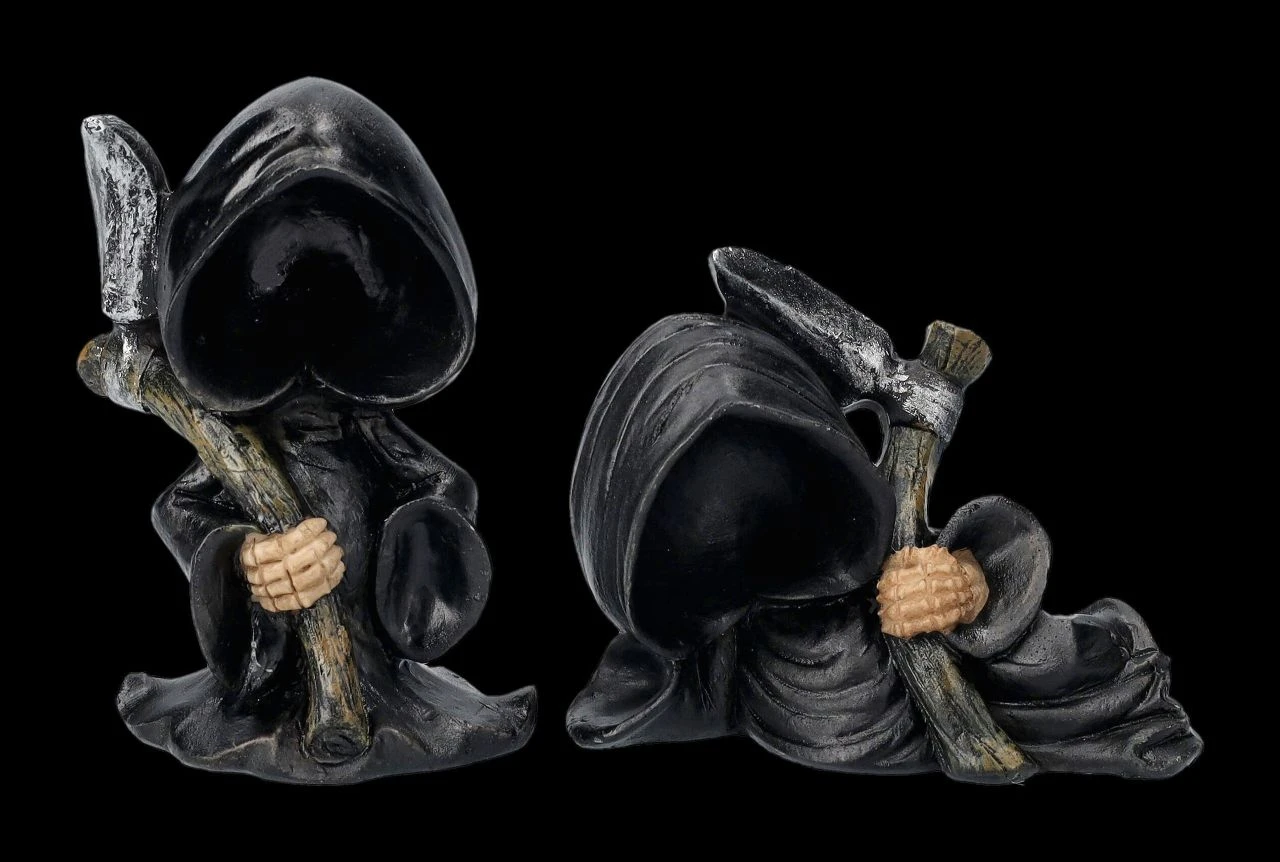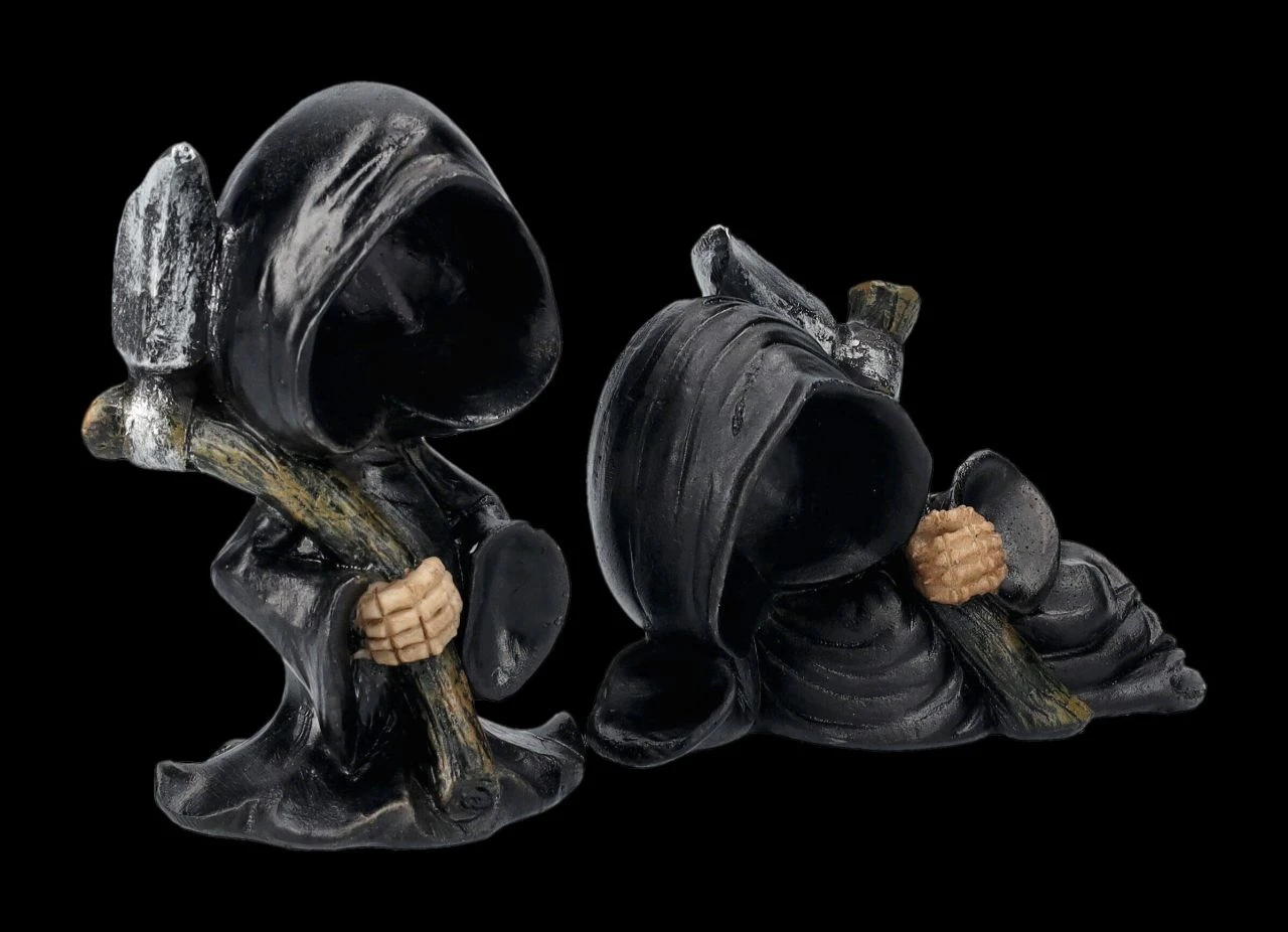 Die beiden Reaper Figuren sind wohl eher eine eher lustige als gruselige Dekoration zum Beispiel fĂĽr Halloween. Während sich einer der beiden Creapers lässig auf den Boden gelegt hat, versucht der andere sich anzuschleichen. Die beiden aus handbemaltem Kunststein (Polyresin) gefertigten Reaper-Figuren sind 6,5 – 9 cm hoch, 6 – 9 cm breit und 4,5 – 5 cm tief. FĂĽr alle, die es nicht ganz so horrormäßig möchten, sind sie auch ein witziges Geschenk.