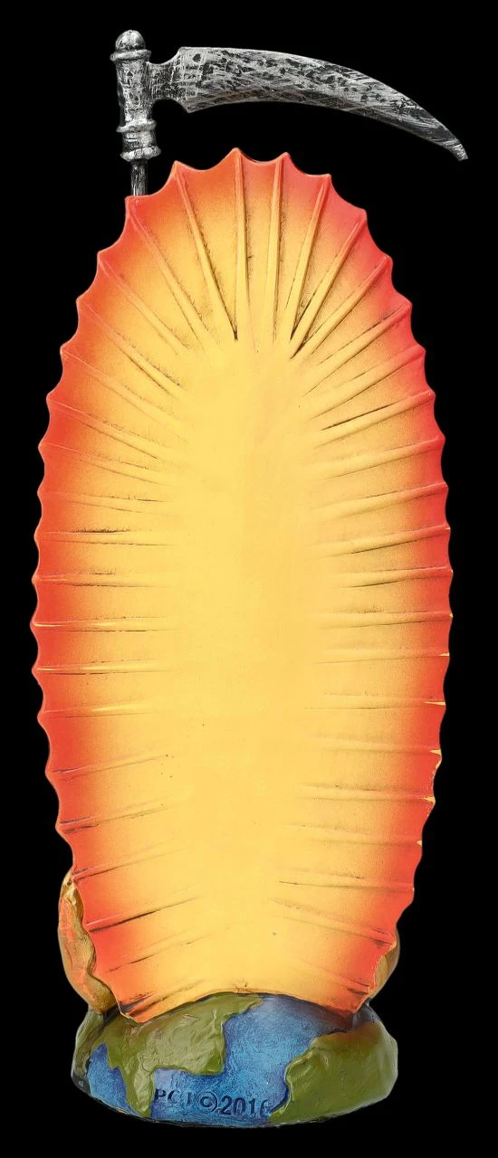 Die Laterne in der rechten Hand und seine Sense in der linken, steht der Sensenmann in edlem goldenen Umhang als Heiliger Tod vor einem roten Strahlenkranz auf der Erde. Ob reich oder arm – er ist es schließlich, der letztendlich alle in sein Reich holen wird. Dass er kluge Entscheidungen über den Zeitpunkt stellt, beweist die Eule als Symbol der Weisheit, die ihn begleitet. Der 18,5 cm hohe, 7,5 cm breite und 6 cm tiefe Sensenmann im goldenen Umhang ist aus handbemaltem Kunststein (Polyresin). Die Santa Muerte Figur ist eine magische Deko zum Dia de los Muertos, bei der zwischen dem 31. Oktober und 2. November unterhaltsam an die Verstorbenen gedacht wird.