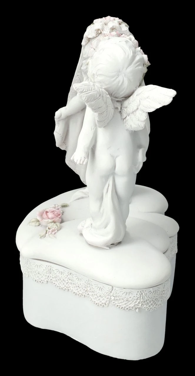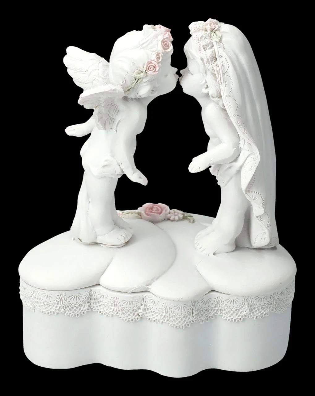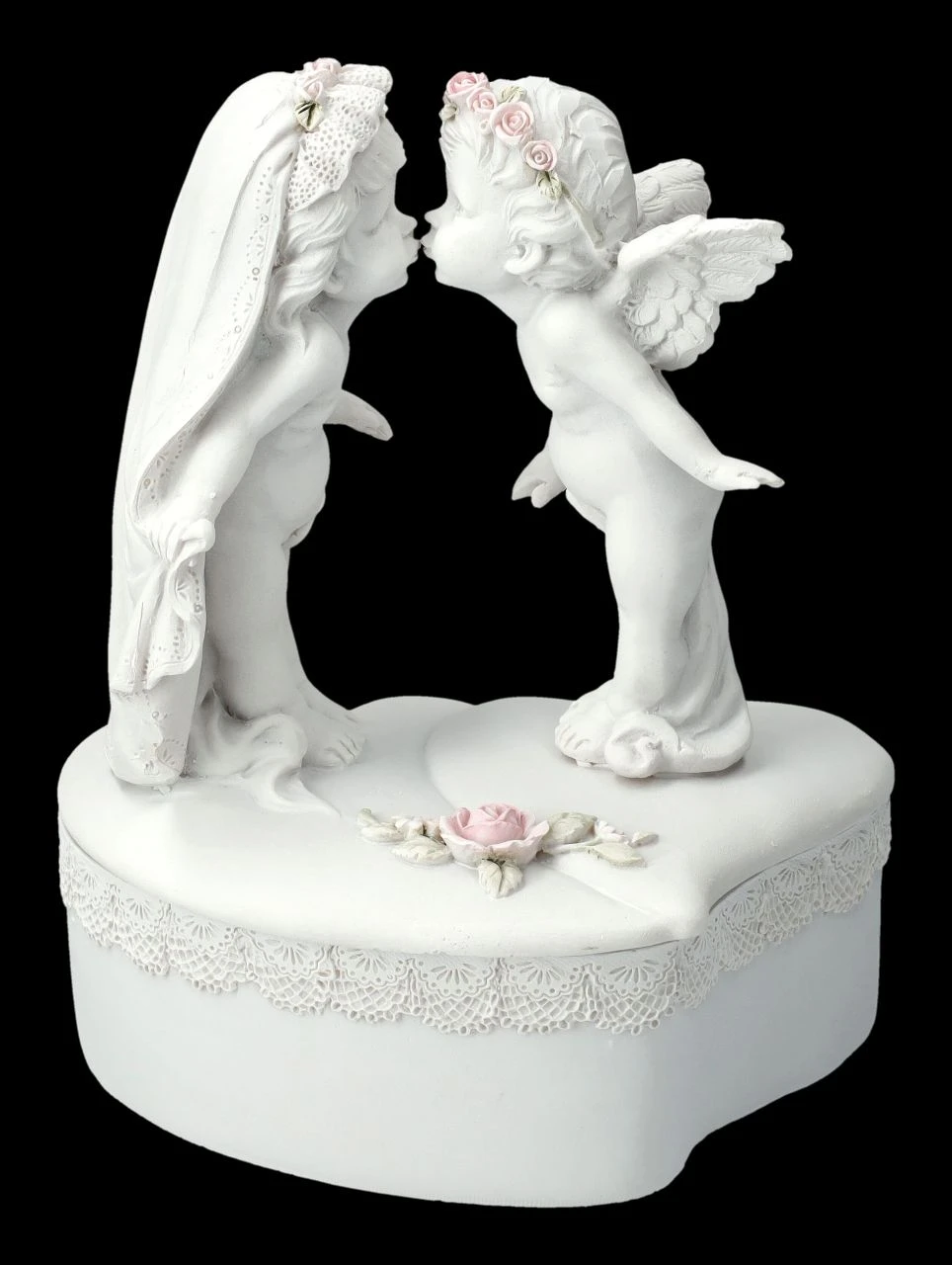 Eine wunderbare Gelegenheit für einen Heiratsantrag oder auch als Geschenk, um die Eheringe perfekt zu präsentieren, ist diese fantastische romantische Schatulle mit den küssenden Putten. Mit dem Puttenbrautpaar ist diese schöne Schatulle 17 cm hoch, 13 cm breit und 8,5 cm tief. Sie wurde aus liebevoll handbemaltem Kunststein (Polyresin) gefertigt. Innen hat sie mit H 3,5 cm x B 10 cm x T 6,5 cm aber auch Platz für kleine romantische Erinnerungsstücke.