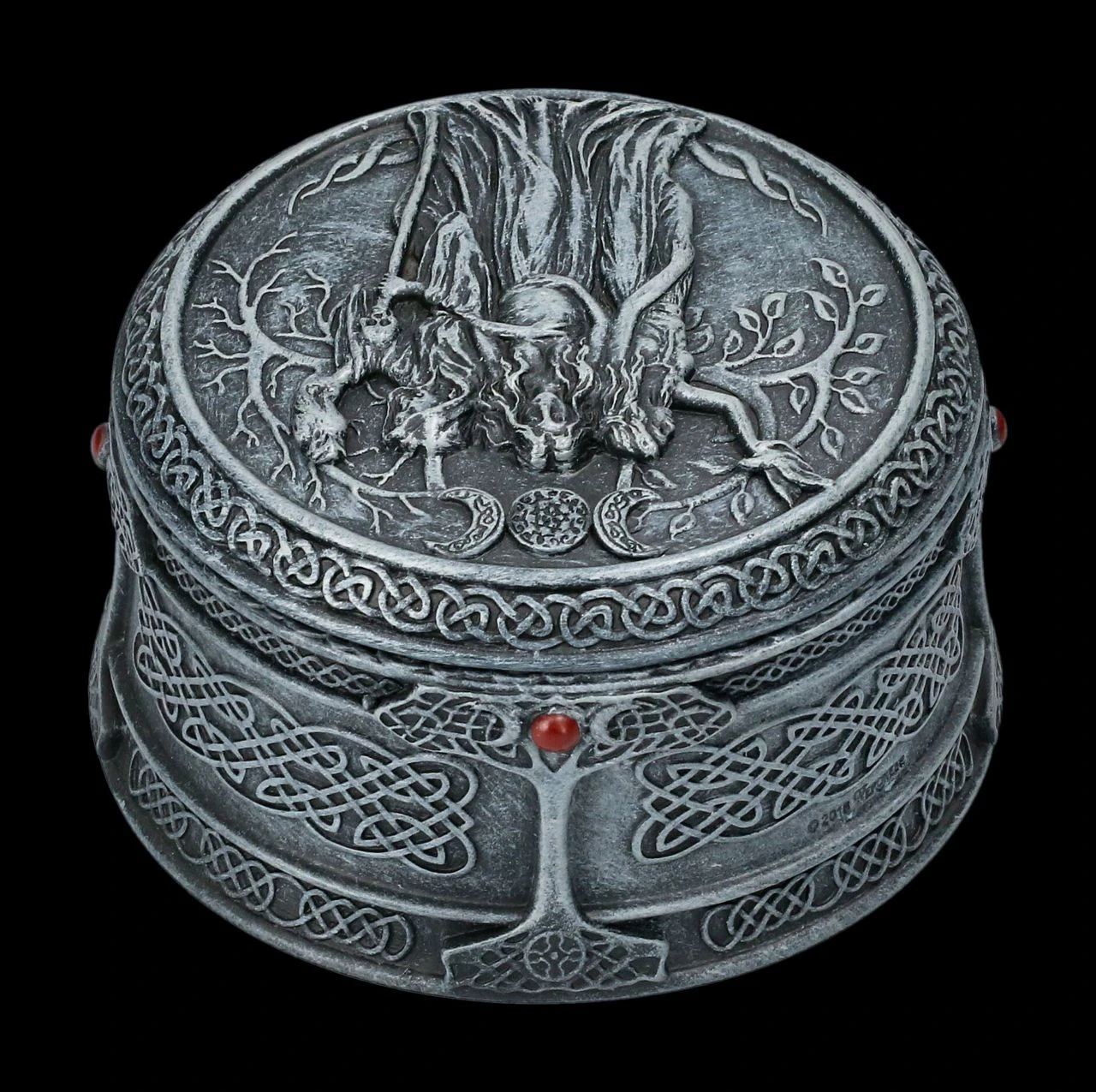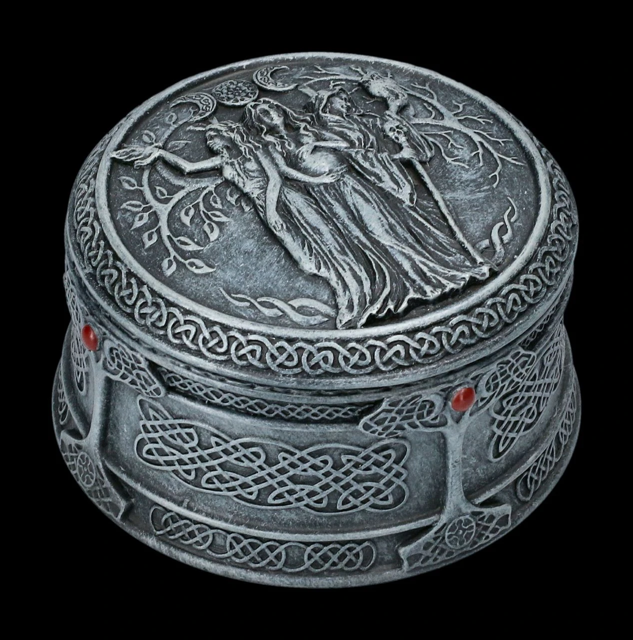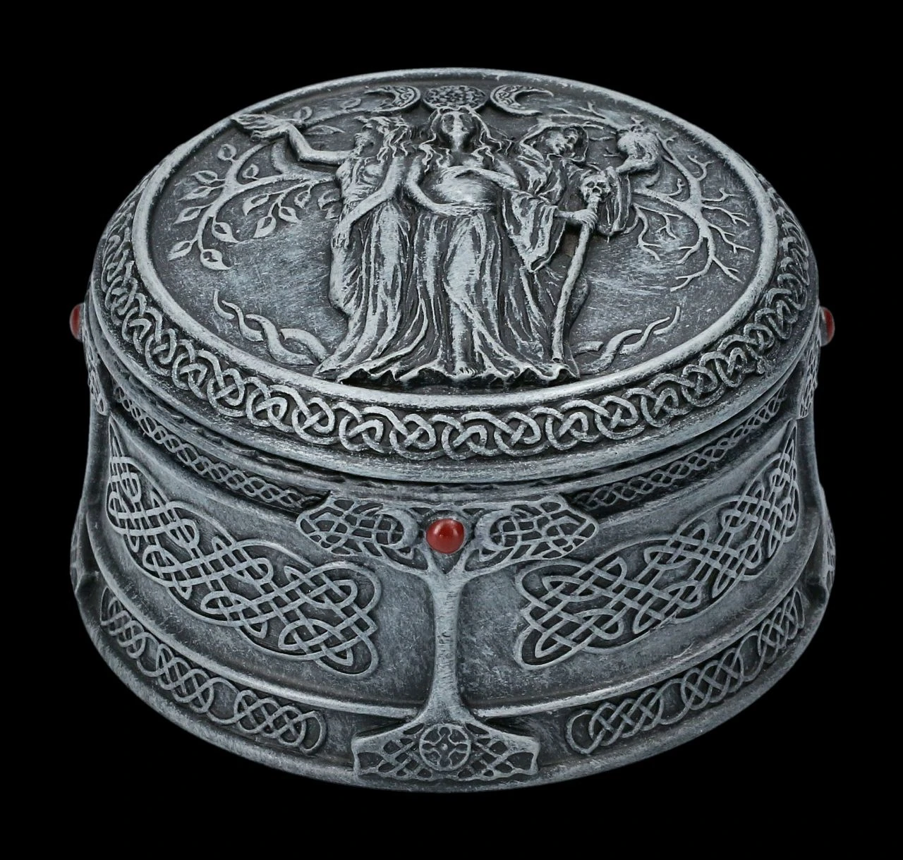 Eine fantastische Aufbewahrung für Ihre kleinen Kostbarkeiten ist die schön verzierte Schatulle aus der Studio Collection von Veronese. Auf dem Deckel der Schatulle steht Hekate, die Göttin der Magie, der Theurgie, der Nekromantie (Totenbeschwörung) vor einem Lebensbaum. Die Dreifach-Göttin Hekate wird auch als Göttin der Wegkreuzungen bzw. Weggabelungen, Schwellen und Übergänge und die Wächterin der Tore zwischen den Welten verehrt. Rote Schmucksteine leuchten am mit keltischen Symbolen verzierten Rand der schwarzen Schatulle aus Kunststein (Polyresin). Die 5,5 cm hohe Schatulle mit dem Durchmesser von 9,5 cm hat innen mit den Maßen H: 3,5 cm und D: 7,5 cm aber auch Platz für ein besonderes Geschenk