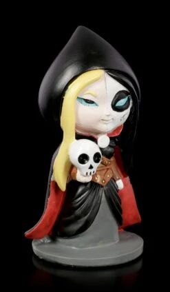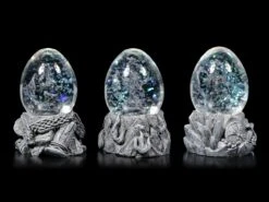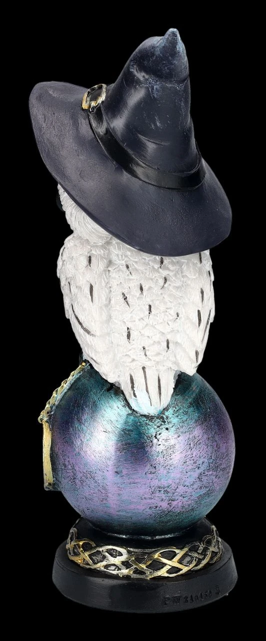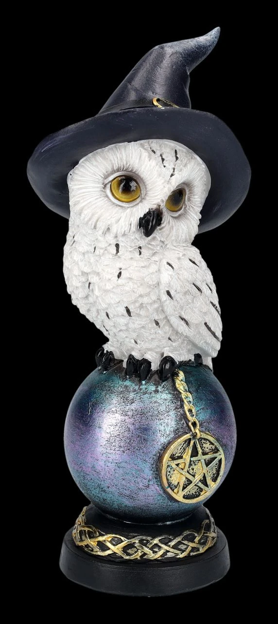 Mit treuherzig geneigtem Kopf und großen Augen blickt diese kleine Schneeeule mit dem Zauberhut nach rechts. Sie sitzt auf einer auf einem Sockel stehenden magischen Kugel und hält mit den Krallen ein Amulett mit einem Pentagramm fest. Die 20 cm hohe, 7 cm breite und 7 cm tiefe Schneeeulen-Figur wurde aus liebevoll handbemaltem Kunststein (Polyresin) gefertigt. Für Eulen-Fans ist sie – vielleicht auch gleich in Gesellschaft mit unserer nach links blickenden Schneeeule – ein fantastisches Geschenk.