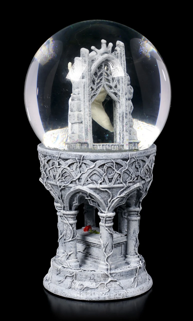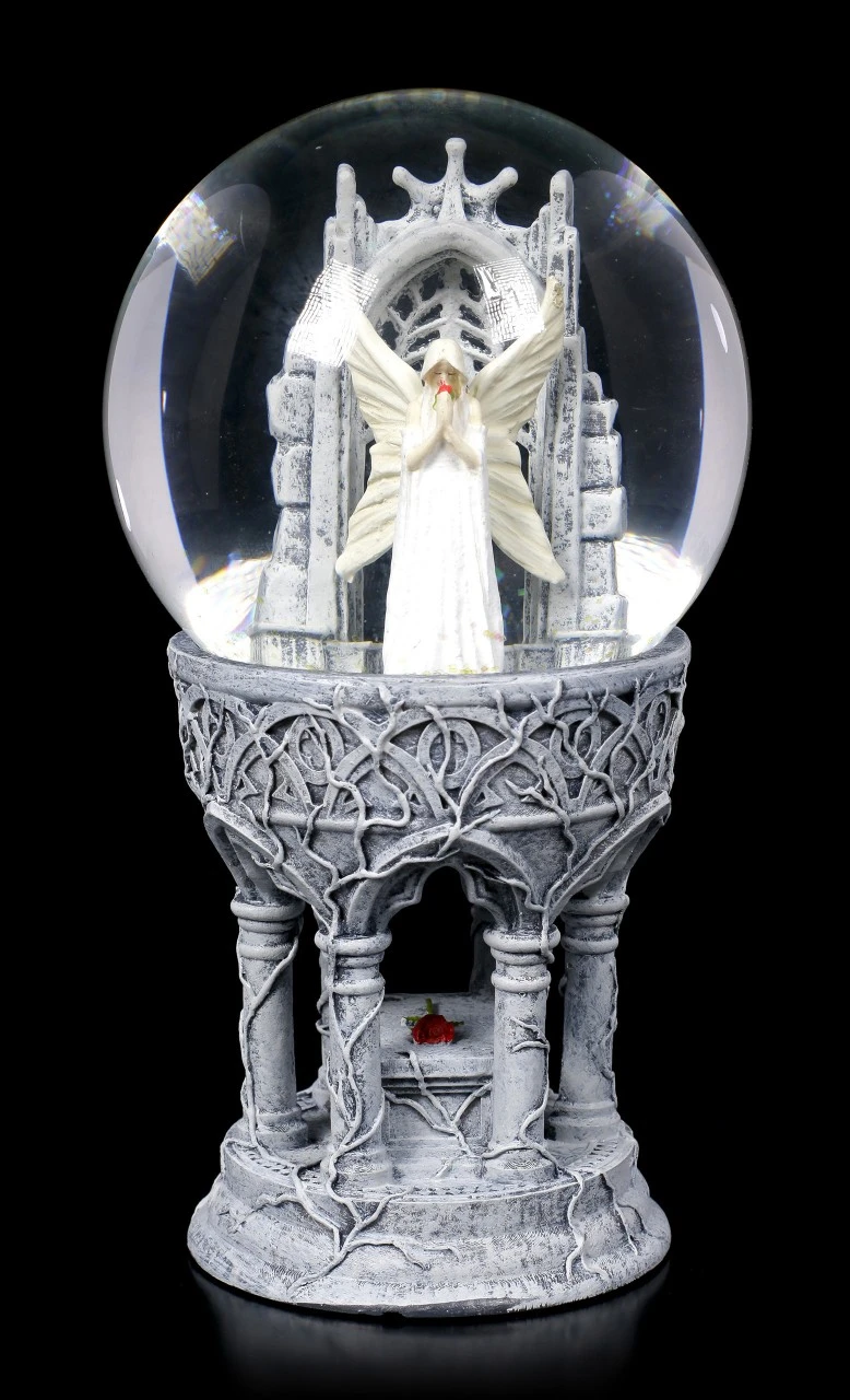 Die umwerfende, detailreiche Schneekugel Only Love Remains entsprang der Fantasie der Gothic- und Fantasy-Künstlerin Anne Stokes. Eine weißhaarige Elfe steht mit gesenktem Kopf in einer Kathedrale. Sie trägt ein langes weißes Spitzenkleid. Hinter ihr öffnen sich weiße Flügel, auf denen sich dasselbe Muster wie auf dem Kleid wiederholt. Mit geschlossenen Augen hält sie einen kleinen Strauß roter Rosen an ihr Gesicht, sie scheint ganz in Träumereien versunken zu sein. Nach allem, was geschehen ist, nach allem, was gesagt und getan wurde, ist alles, was übrig bleibt, Liebe. Diese handbemalte Schneekugel aus Kunststein (Polyresin) und Glas ist das perfekte Geschenk für einen lieben Menschen, der bei jedem Schütteln ein bisschen Magie sehen möchte.
