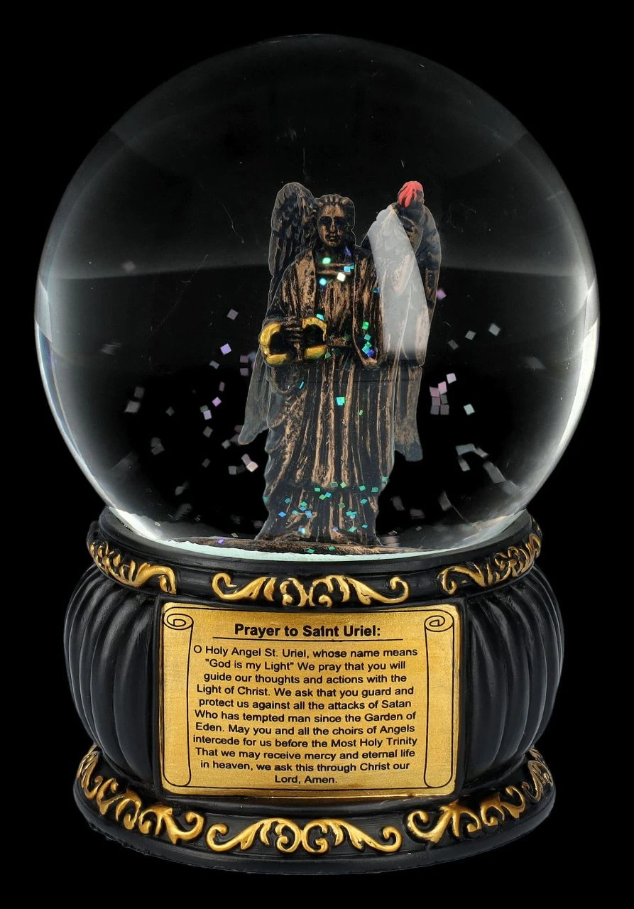 Diese wunderbare Schneekugel zeigt im Inneren der Glaskugel den Erzengel Uriel. Die Figur und die Halterung der Glaskugel sind aus handbemaltem Kunststein (Polyresin). Auf der Halterung ist ein englisches Gebet zu lesen. Übersetzt heißt das Gebet in etwa: ‚Gebet zum Heiligen Uriel. O Heiliger Engel St. Uriel, dessen Name „Gott ist mein Licht“ bedeutet. Wir beten, dass unsere Gedanken und Handlungen vom Licht Christi geleitet wird. Wir bitten Dich, uns vor allen Angriffen Satans zu schützen, der die Menschen seit dem Garten Eden in Versuchung geführt hat. Mögest Du und alle Chöre der Engel vor der Allerheiligsten Dreifaltigkeit für uns eintreten. Dass wir Barmherzigkeit und ewiges Leben im Himmel empfangen, darum bitten wir durch Christus, unseren Herrn. Amen.‘ Die 14 cm hohe, 10 cm breite und 10 cm tiefe Schneekugel ist also ein wunderbares Geschenk nicht nur für Sammler, sondern auch für alle Gläubigen.