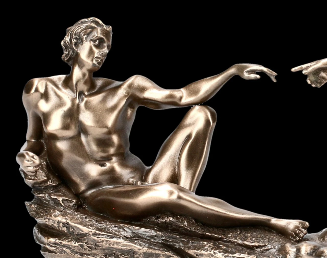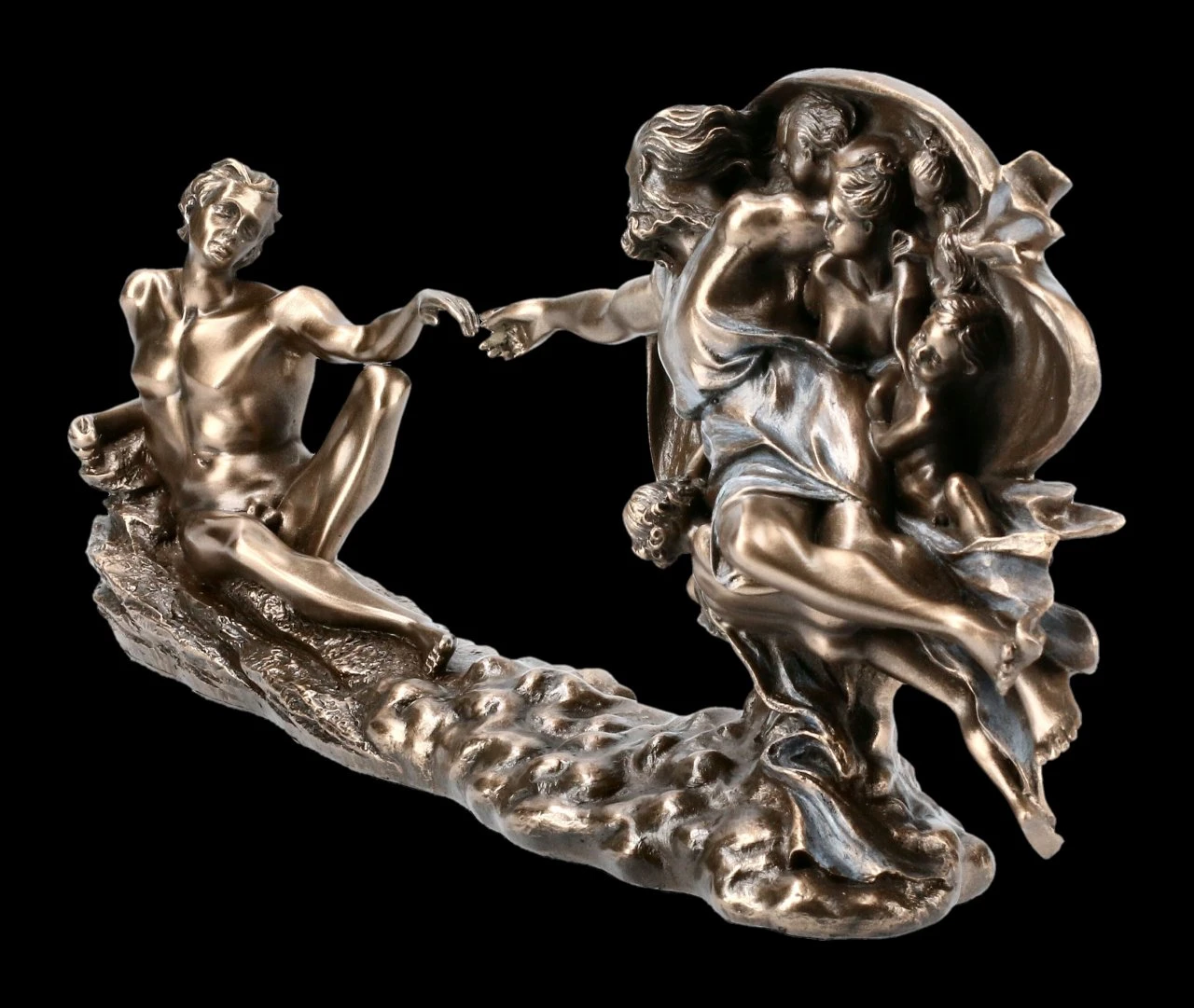 Dem beeindruckenden Deckenfresco von Michelangelo, das sich in der Sixtinischen Kapelle befindet, wurde diese edel bronzierte und fein colorierte Figur aus hochwertigem Kunststein (Polyresin) nachempfunden. Gott im Himmel erschafft Adam auf der Erde. Diese wundervolle Figur aus der Studio Collection von Veronese hat eine fantastische Ausstrahlung und wird so zum effektvollen Blickfang in jedem Ambiente.