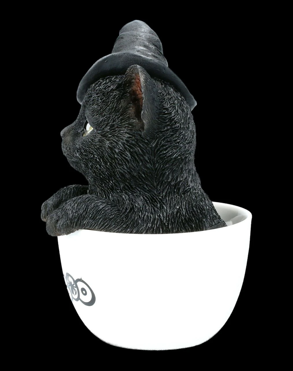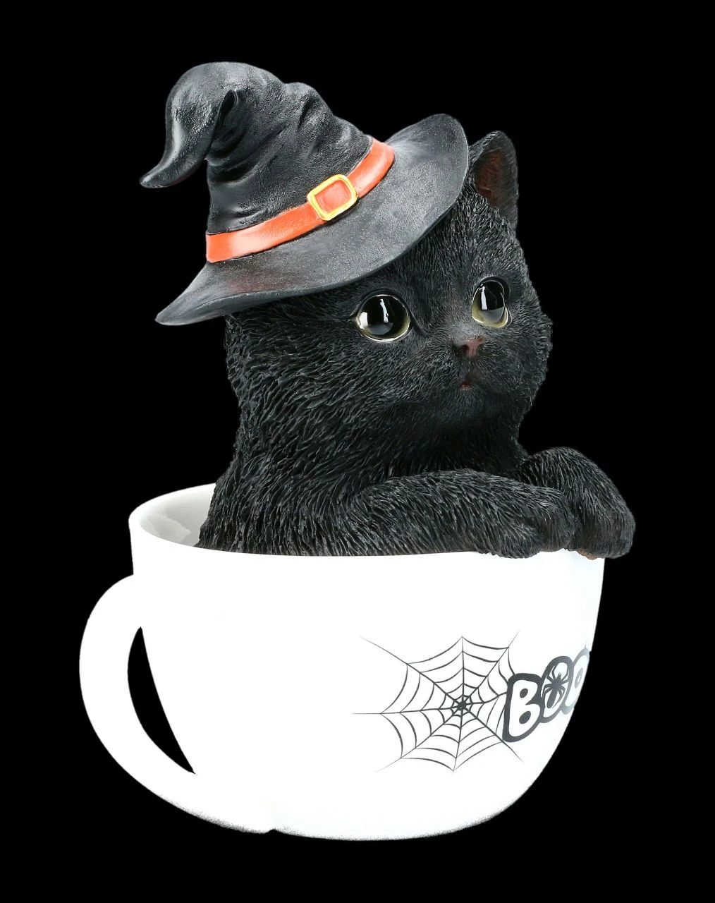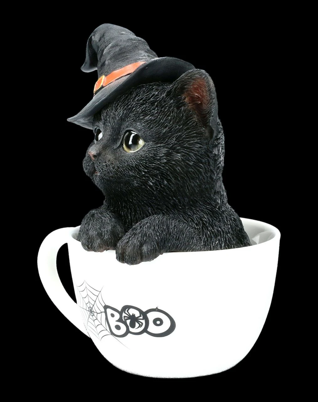 Schwarzer Kaffee hat jetzt in meiner Tasse keinen Platz mehr, denn da habe ich es mir schon bequem gemacht. Das scheint diese süße schwarze Hexen-Katze mit ihren glänzenden Augen und unschuldigem Blick zu sagen. Der Hexenhut zeigt auch, dass man gar nicht erst versuchen soll, Kaffee in diese Tasse zu gießen. Die lustige schwarze Hexen-Katze in der Tasse ist 16,0 cm hoch, 12,0 cm breit und 10,0 cm tief und aus handbemaltem Kunststein (Polyresin). Ein zauberhaftes Geschenk für Katzenfreunde.und das nicht nur zu Halloween.