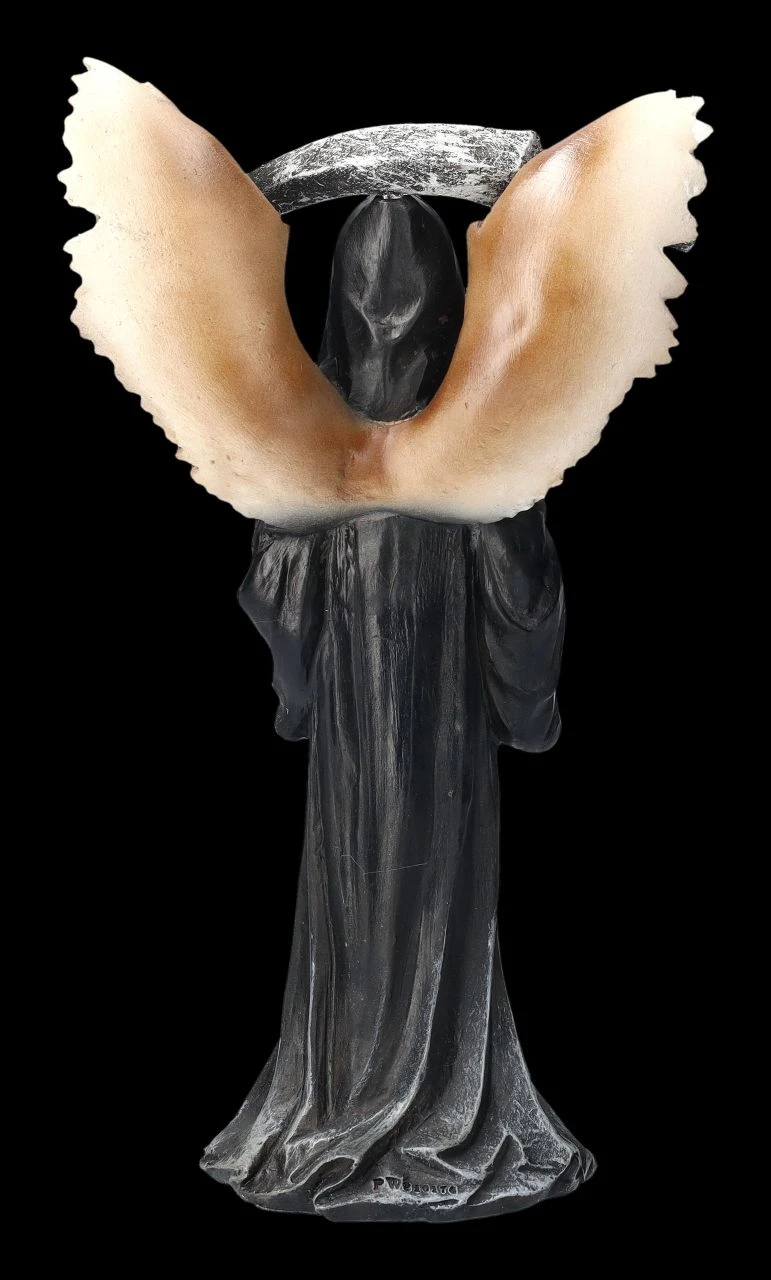 Helle Engelsfrügel trägt dieser Reaper, der düster mit der Glocke läutet. Wen will er wohin rufen? Die Engelsflügel geben diesem Reaper aber ein tröstendes Aussehen. Diese außergewöhnliche Reaper-Figur mit der Glocke wurde sehr detailreich aus handbemaltem Kunststein (Polyresin) gefertigt. Mit der Höhe von 24 cm, der Breite von 15 cm und der Tiefe von 8,5 cm ist diese mystische Reaper-Figur mit dem Gruseleffect eine fantasievolle Deko, aber durchaus auch ein perfektes Geschenk für jemanden, dem man in seiner Trauer Trost spenden möchte.