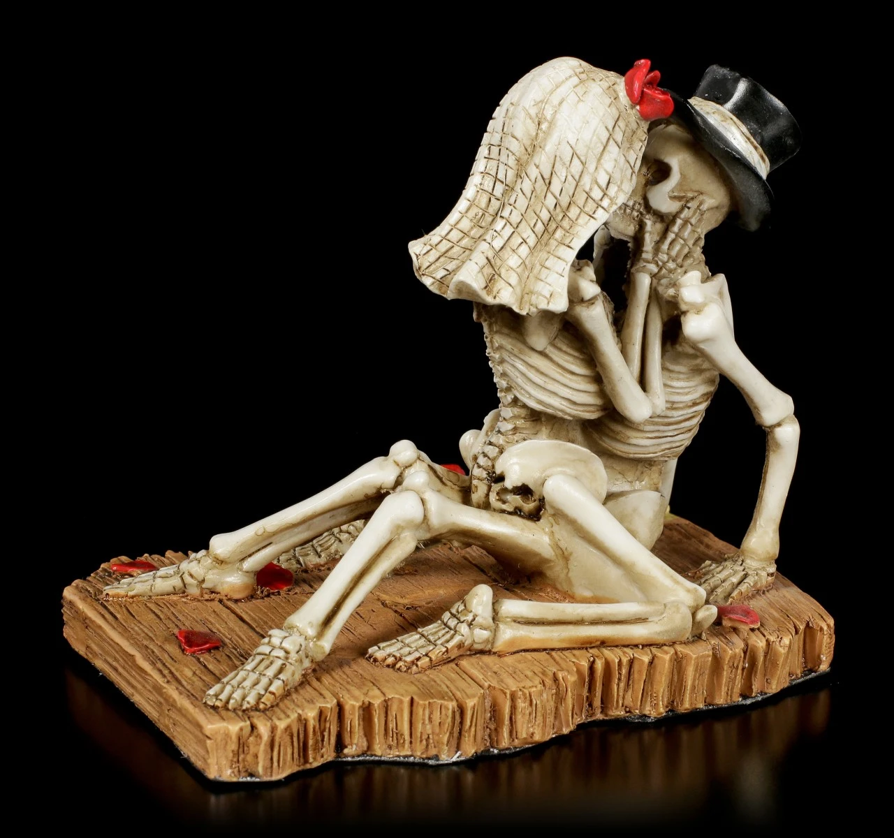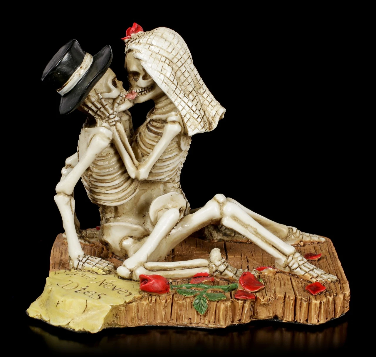 Love never Dies! Liebe gibt es auch unter den Untoten. Das jung vermählte Skelettpaar kann gar nicht genug von einander bekommen. Das süße handbemalte Kunststein Pärchen ist das perfekte Hochzeitsgeschenk oder auch das perfekte Topping für eine Torte, wenn der Bäcker etwas findig ist.