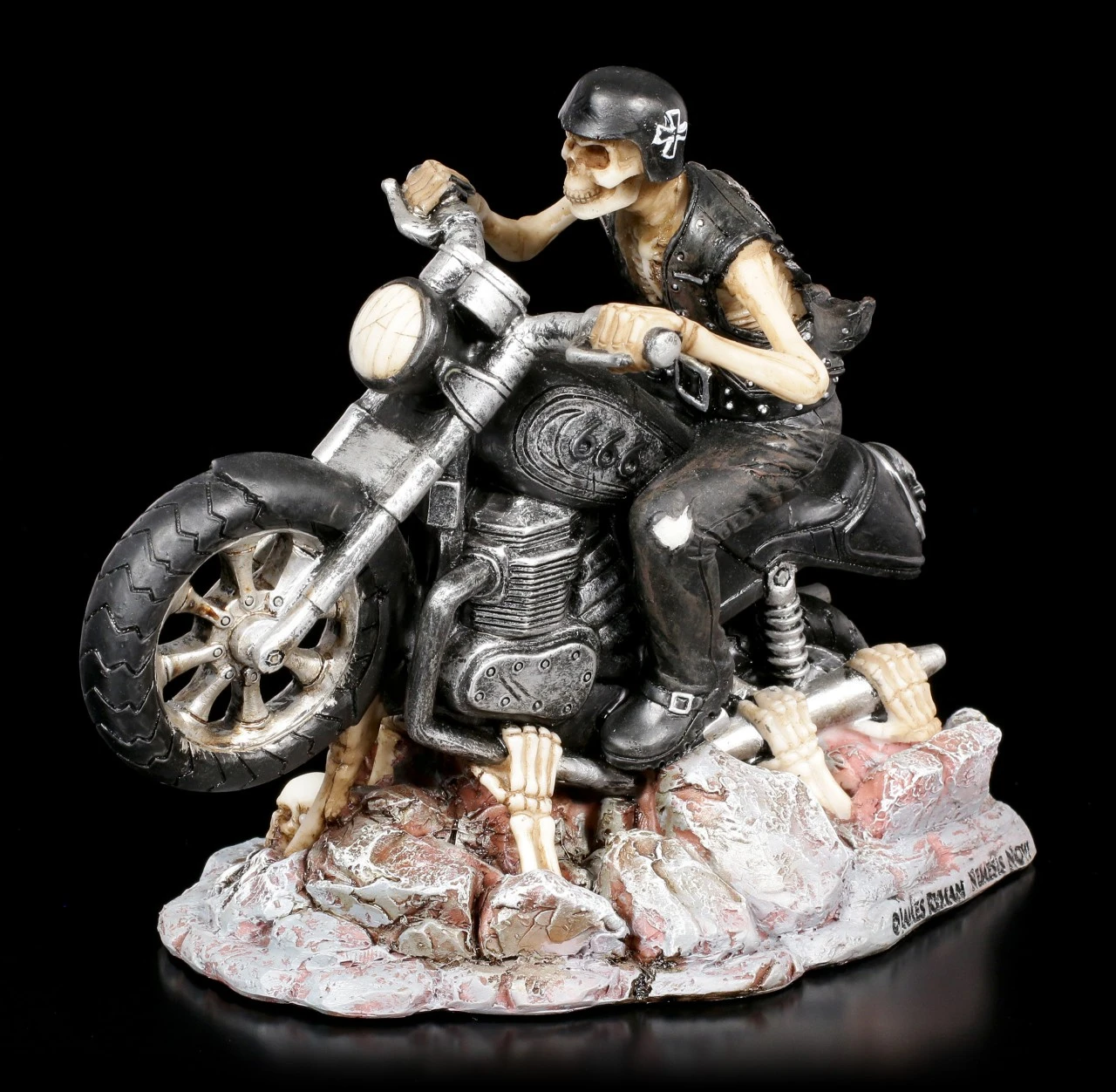 Dieses Skelett hat es geschafft. Es hat ein Motorrad gestohlen und fährt über die verlorenen Seele aus der Hölle in die große weite Welt. Die Skelett Figur von James Ryman ist ein ideales Geschenk an einen Biker.
