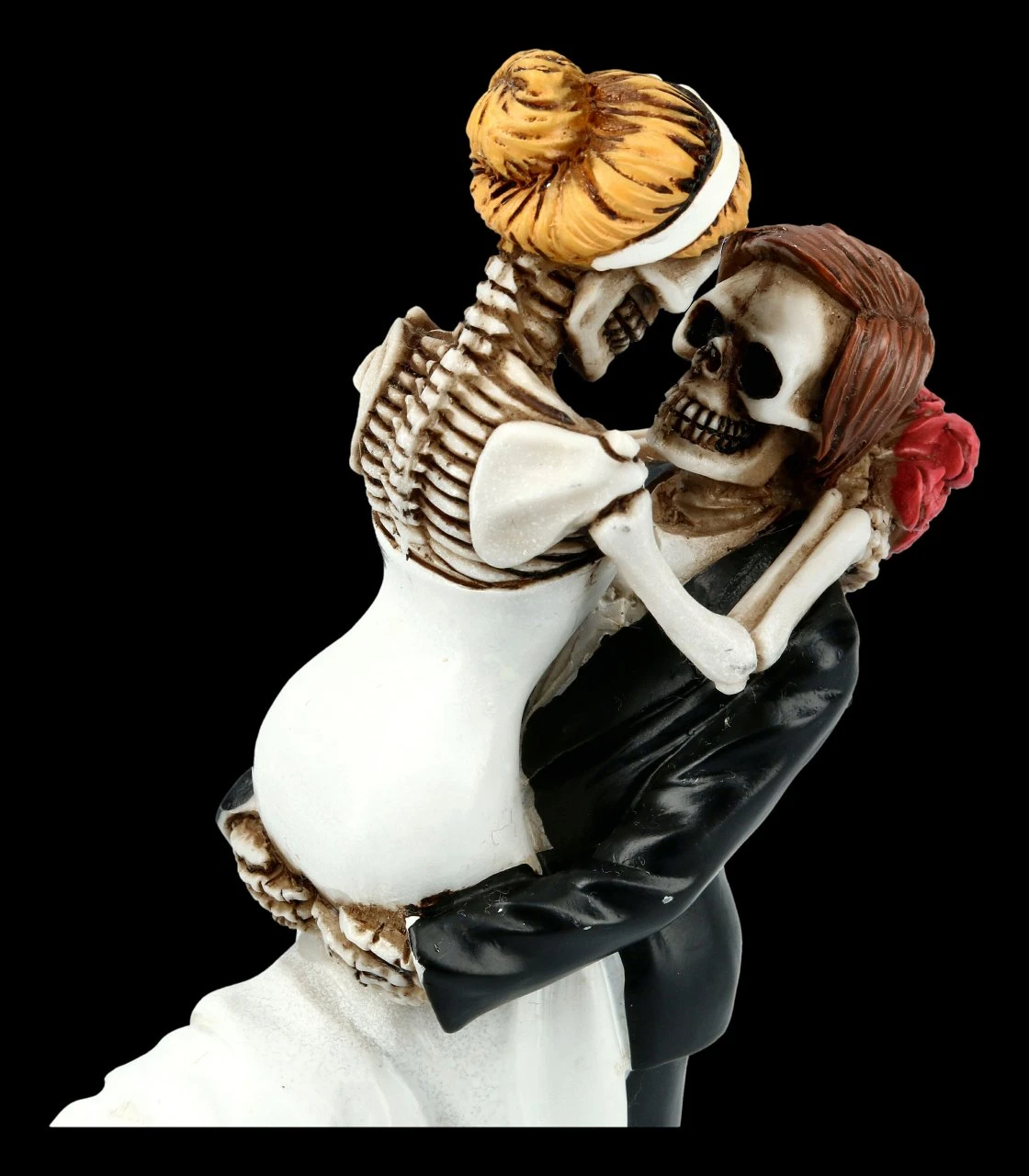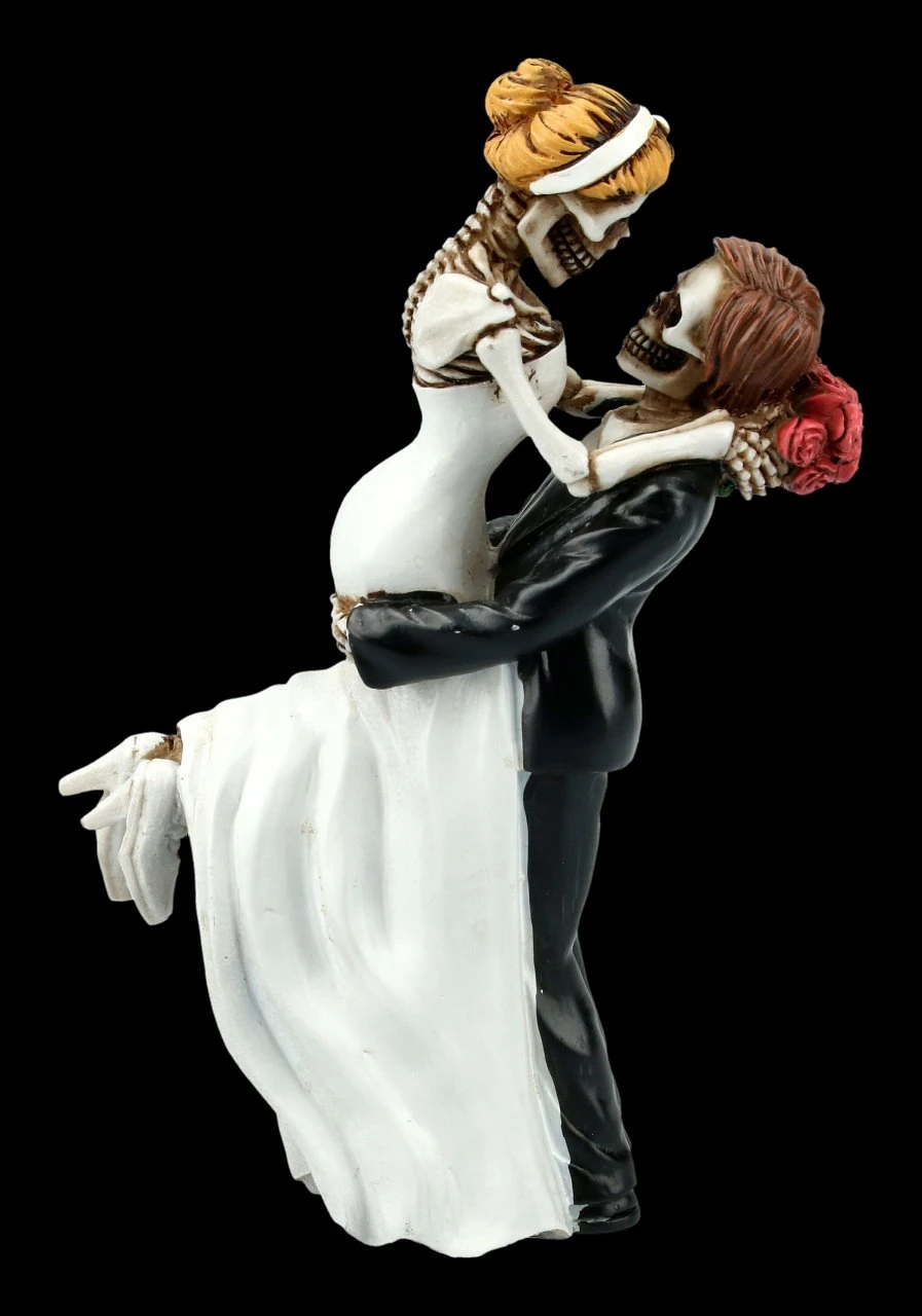 Vor Glück strahlend, hebt der Bräutigam im schwarzen chicen Smoking seine Braut im langen weißen Brautkleid hoch. Die witzige und ausgefallene Deko mit dem Skelett-Brautpaar soll zeigen, dass die Liebe bis in alle Ewigkeit dauern wird. Das liebevoll handbemalte Skelett Liebespaar ist sehr detailreich aus Kunststein (Polyresin) gefertigt und hat eine Höhe von 15,5 cm, eine Breite von 10,5 cm und eine Tiefe von 4,5 cm. Diese Hochzeitsdeko mit dem Skelett-Brautpaar Love Never Dies wird mit Sicherheit allen im Gedächtnis bleiben.