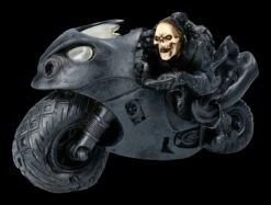 Gib Gummi – scheint das Skelett auf dem Motorrad mit großem Vergnügen zu brüllen, während es in die Kurve rast. Man kann es beinahe hören. Detailreich aus handbemaltem Kunststein (Polyresin) gefertigt, ist das 12 cm hohe, 18,5 cm breite und 10,5 cm tiefe rasende Skeltt auf dem Motorrad ein toller Blickfang. Speed Freak ist aber auch ein hammermäßiges Geschenk für jeden Biker.