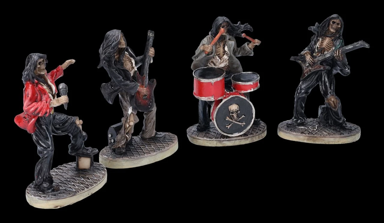 Diese Band rockt die Hölle, da tanzt sogar das Höllenfeuer und die Knochen wackeln, wenn die vier loslegen. Das witzige Skelett Figuren-Set One Hell of a Band aus Kunststein (Polyresin) wurde detailreich handbemalt. Die Figuren sind je 10 cm hoch, je 7 cm breit und je 4 cm tief und eine tolle Deko für Halloween oder für die nächste Party.