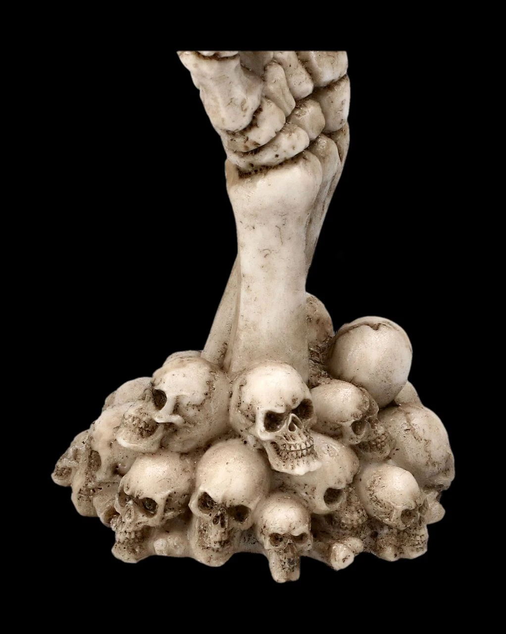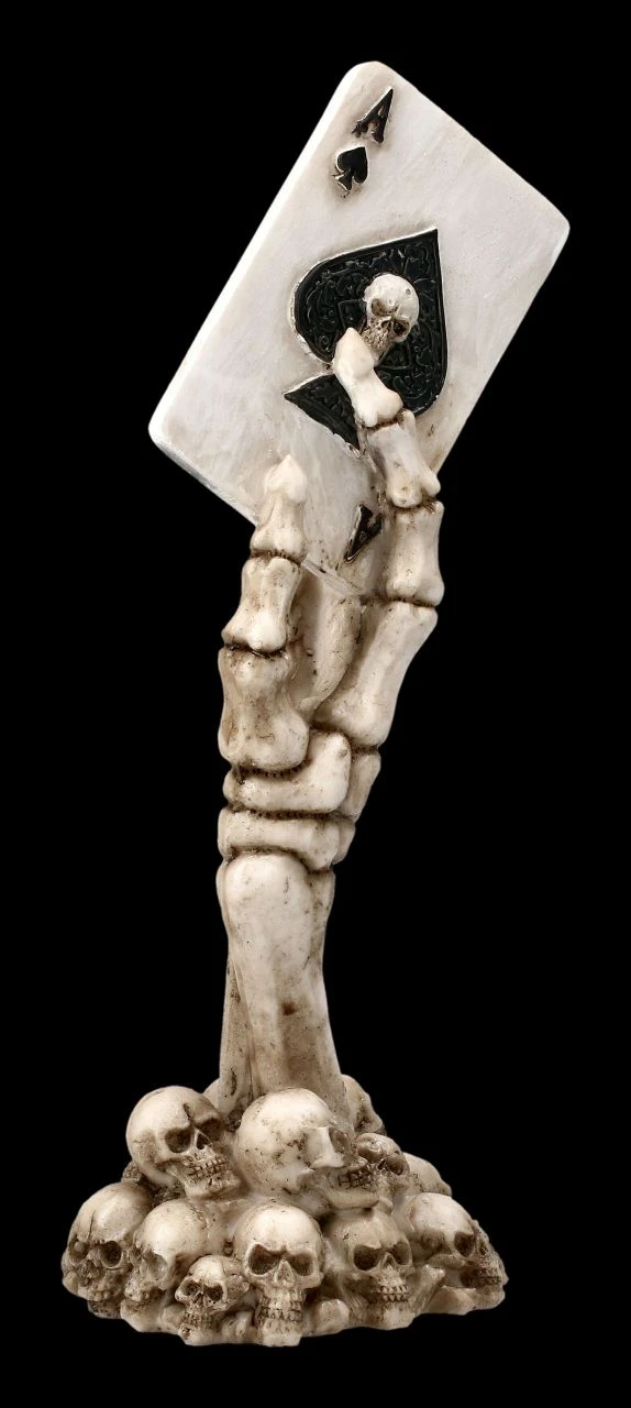Glücksbringer am Kartentisch, oder doch die Warnung, kein Ass im Ärmel zurückzuhalten? Auf jeden Fall wird diese witzige Skelett Hand mit dem Pik Ass in der Hand der absolute Hingucker bei jedem Kartenspiel. Die aus mehreren Totenschädeln ragende Skelett Hand „Ace up your Sleeve“ ist sehr detailreich aus handbemaltem Kunststein (Polyresin) gefertigt. Sie ist 18 cm hoch, 7 cm breit und 5,5 cm tief.