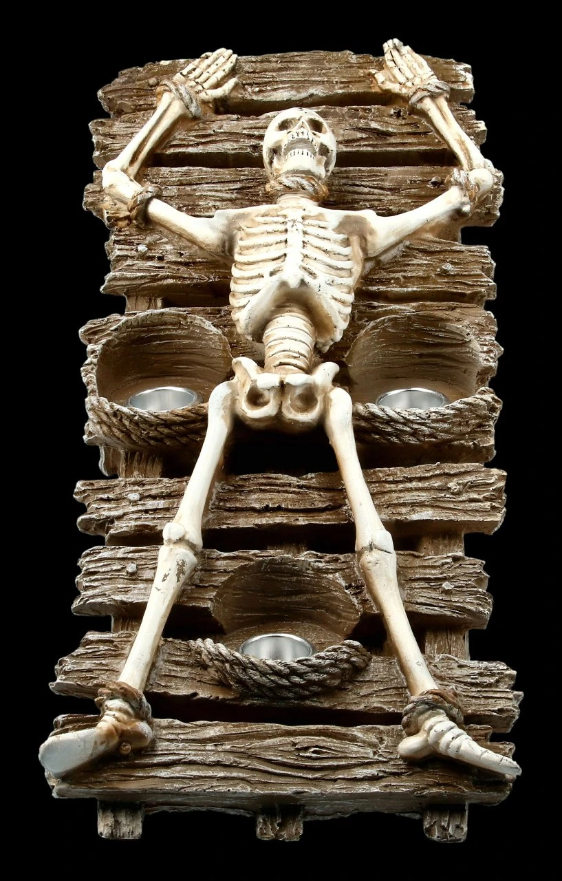 Was mag der arme Tropf wohl verbrochen haben, dass er auf der Streckbank festgebunden wurde? Ob es ein Ritual war? Denn der Platz für die 3 Kerzen lässt darauf schließen. Der außergewöhnliche, 18 cm hohe, 31 cm breite und 16,5 cm tiefe Kerzenhalter aus handbemaltem Kunststein (Polyresin) wird Sie begeistern.