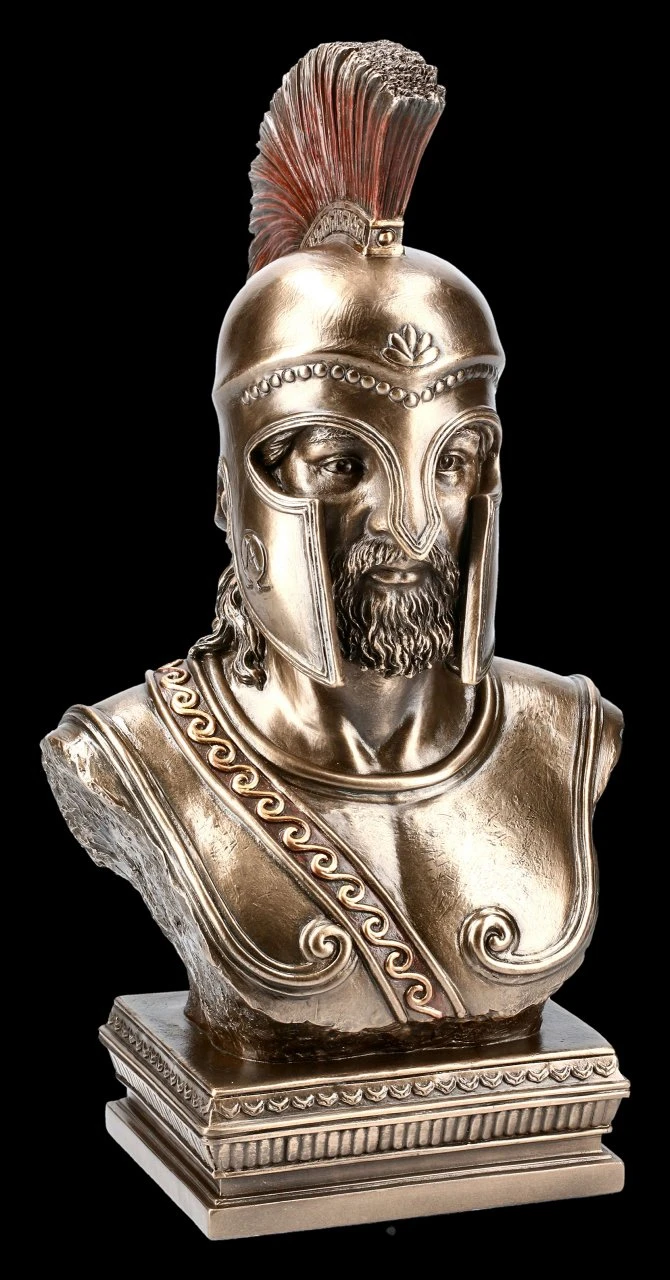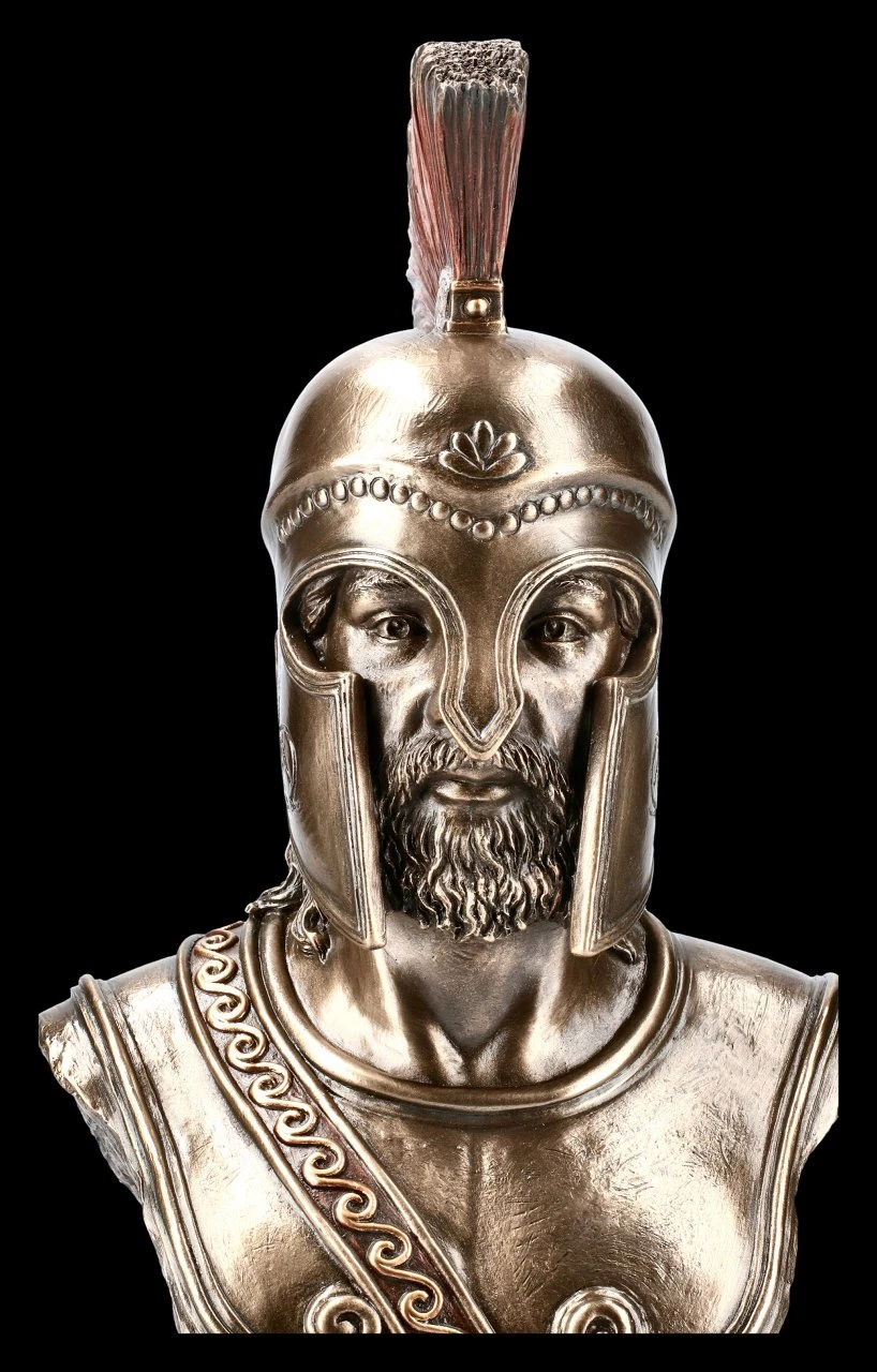 Zur Hoplitenrüstung der spartanischen Krieger gehörte ein aufwändig gearbeiteter Helm, der mit Pferdehaar geschmückt war. Diese Helme waren so konstruiert, dass sie den bestmöglichsten Schutz im Kampf bieten konnten. Diese umwerfende Büste eines Spartaners aus dem Haus Veronese gehört zur Studio Collection. Die aufwändig verzierte Büste ist aus edel bronziertem und zurückhaltend coloriertem Kunststein (Polyresin) gefertigt.