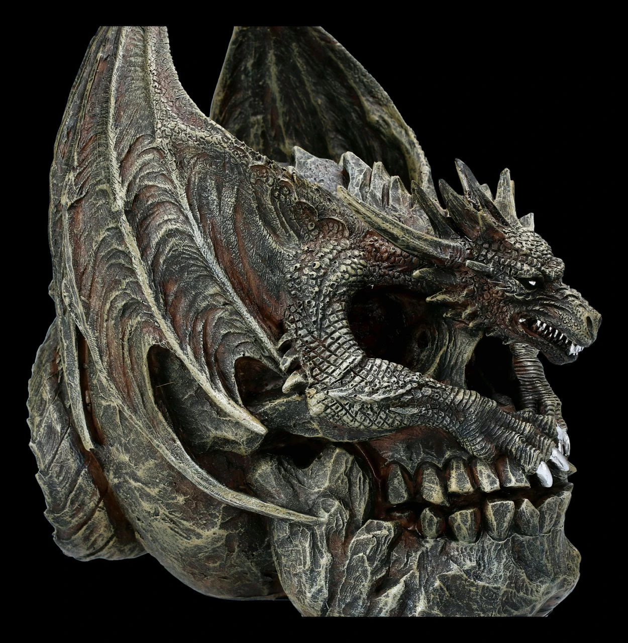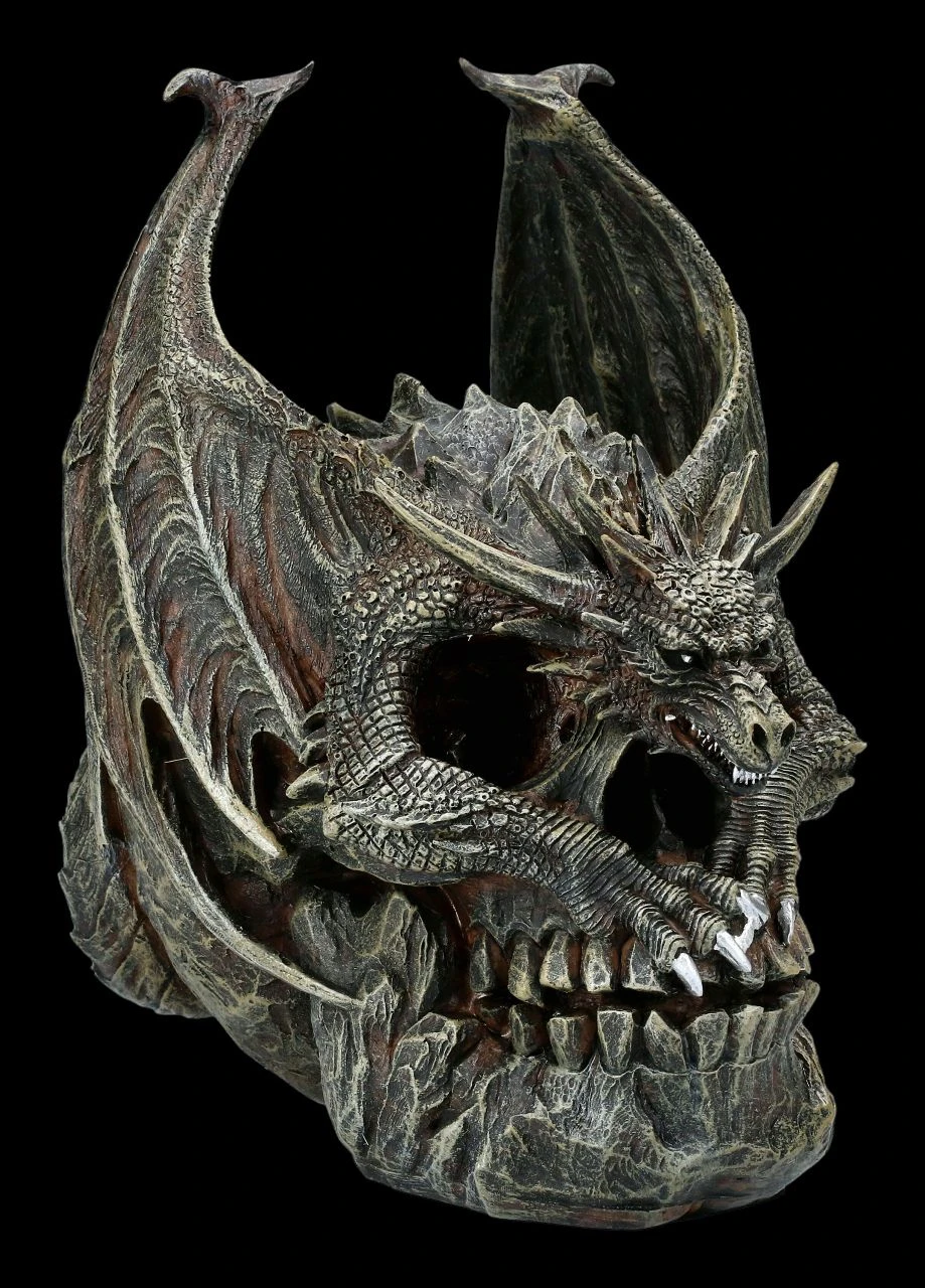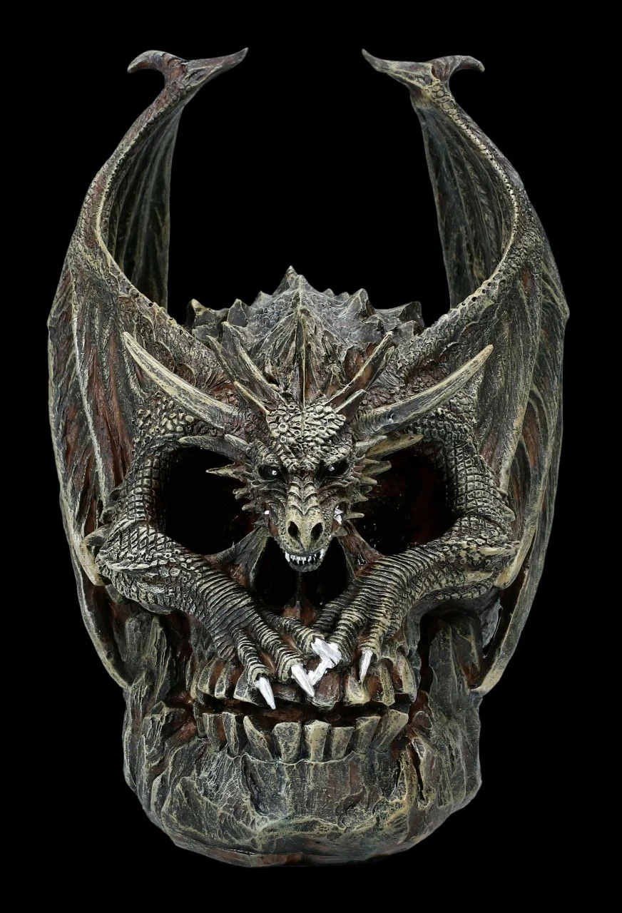 Diesen Totenkopf hat ein faszinierender Drache vollständig in Besitz genommen und verteidigt ihn mit wildem Gebrüll. Der außergewöhnliche Totenkopf mit dem Drachen wird gewiss alle erstaunten Blicke auf sich ziehen. Der Totenkopf „Draco Skull“ von Spiral ist sehr detailreich aus sorgsam handbemaltem Kunststein (Polyresin) gefertigt. Er hat eine Höhe von 19 cm, eine Breite von 15 cm und eine Tiefe von 16 cm. Dieser Draco Skull wird mit Sicherheit von Ihren Besuchern sehr bestaunt werden.