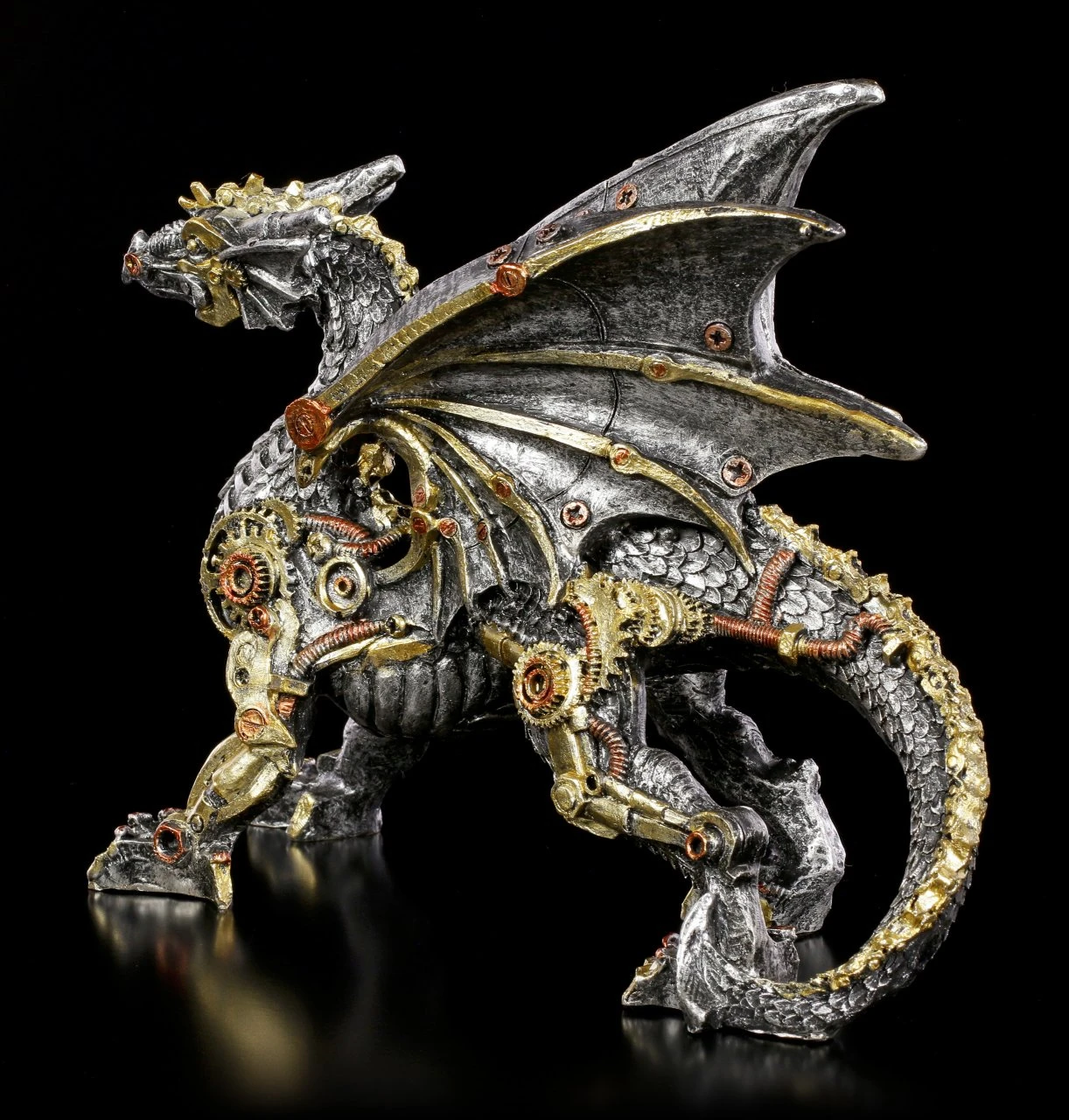 Drache oder Maschine? Die Grenzen sind bei diesem umwerfenden Steampunk Drachen fließend. Diese umwerfende Figur aus handbemaltem Kunststein (Polyresin) ist eine wundervolle Symbiose zwischen dem Fabelwesen und den Kolben, Zahnrädern und Getrieben der industriellen Zeit. Ergänzen Sie Ihre Sammlung mit der kleinen Drachen Figur Dracus Machina.