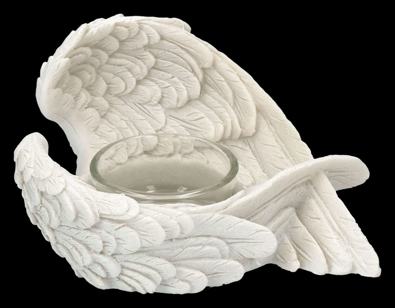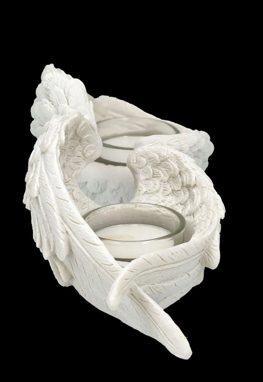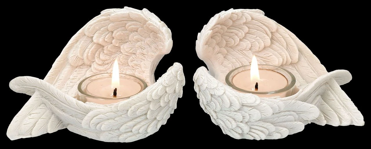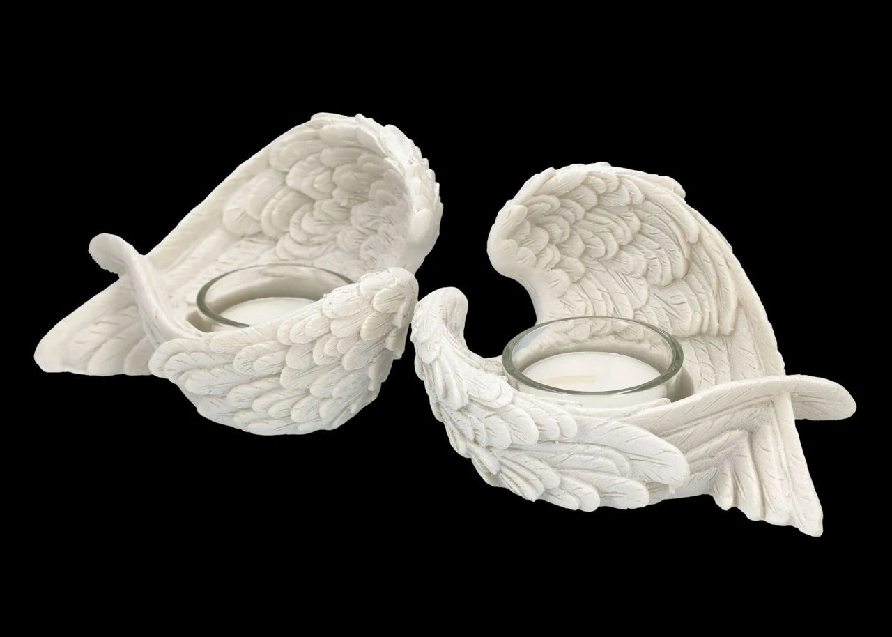 ‚Denkst du an Engel, so bewegen sie ihre Flügel‘, sagt der Volksmund. Nun, bewegen werden sich diese detailreichen Engelsflügel aus liebevoll handbemaltem Kunststein (Polyresin) zwar nicht, aber sie behüten die Flammen der Teelichter, die von den Flügeln gehalten werden. Die wunderbaren je 7,5 cm hohen, je 12 cm breiten und je 8,5 cm tiefen weißen Engelsflügel kommen im 2er Set. Sie sind ein schönes Geschenk, das man sich mit lieben Freunden teilen kann, sie sind aber auch für jeden Hochzeitstisch eine fantastische Deko. Die Lieferung erfolgt ohne Teelichter.