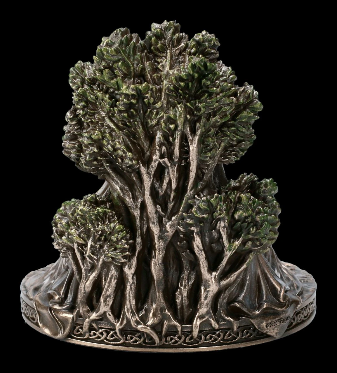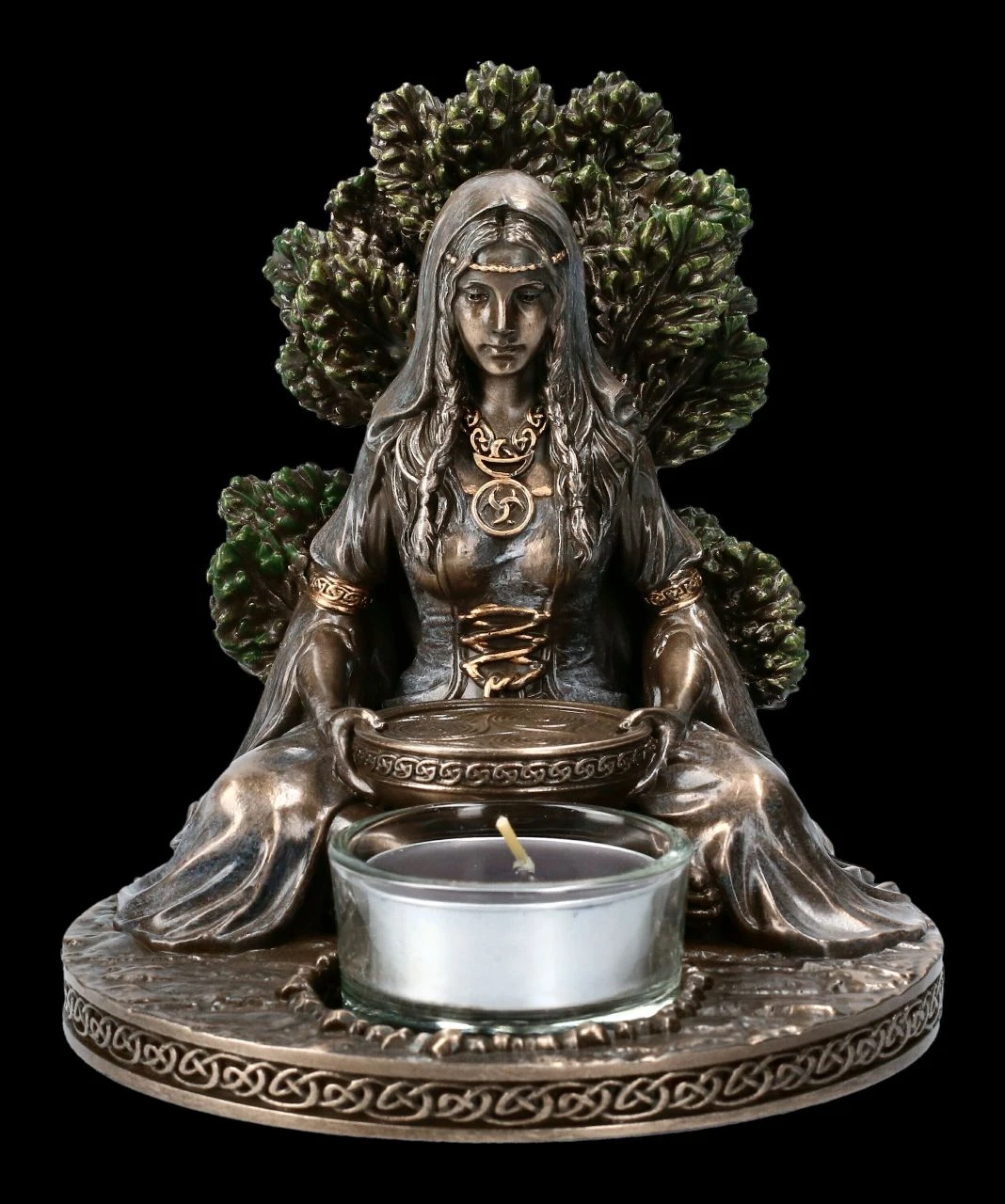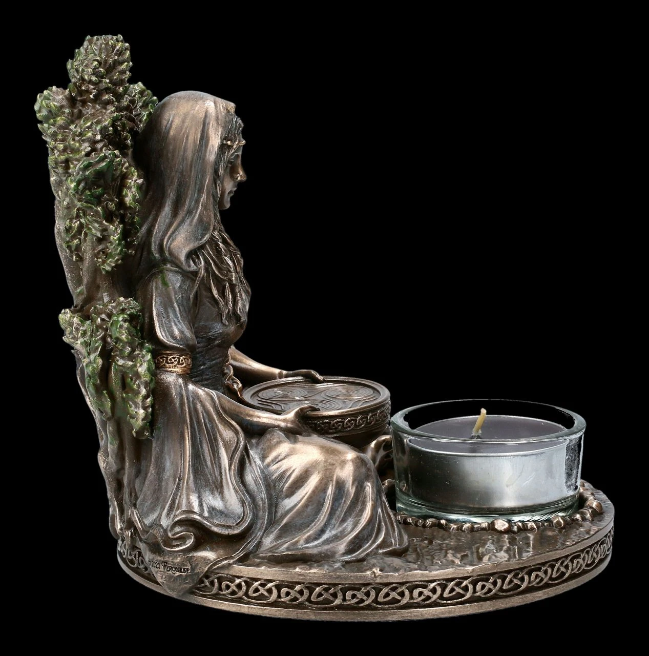 Die Göttin Danu gilt in der irisch-keltischen Mythologie als Mutter der Götter, Herrin des Volkes der Danu und als wichtigste Darstellung für das weibliche Prinzip. Mit diesem stilvollen und dekorativen Teelichthalter aus der Studio Collection von Veronese holen Sie sich die Magie der Göttin Danu in Ihr Zuhause. Der 12 cm hohe, 12 cm breite und 13 cm tiefe Teelichthalter mit der wunderschön dargestellten Göttin Danu ist außerordentlich detailreich aus edel bronziertem und sehr fein coloriertem Kunststein (Polyresin) gefertigt. Er bietet Platz für ein Teelicht mit den Maßen H: ca. 1,3 cm/ D: ca. 3,6 cm. Die Lieferung erfolgt ohne Teelicht.