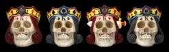 Vier freche Totenköpfe als Deko für Ihren nächsten Pokerabend – wie cool ist das denn! Das geniale 4-er Set ist aus lustig handbemaltem Kunststein (Polyresin) gefertigt. Die witzigen Poker Könige mit ihren Kronen sind je 12 cm hoch, 9,5 cm breit und je 11 cm tief. Um welchen König es sich handelt, ist ihm jeweils auf die Stirm geschrieben und auch auf der Krone zu entdecken. Besonders lustig ist vor allem der Herzkönig, dem auch noch ein Messer im Kopf steckt. Wäre doch interessant, wenn die vier Könige Ihre Pokerfreunde so verwirren, dass Sie jede Runde gewinnen.