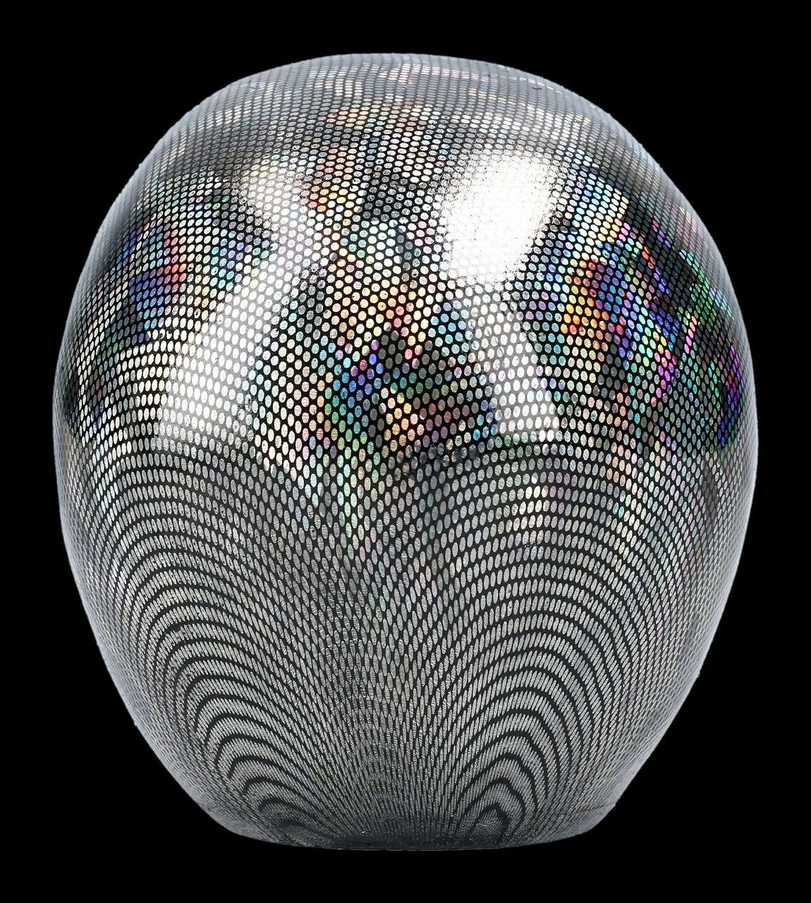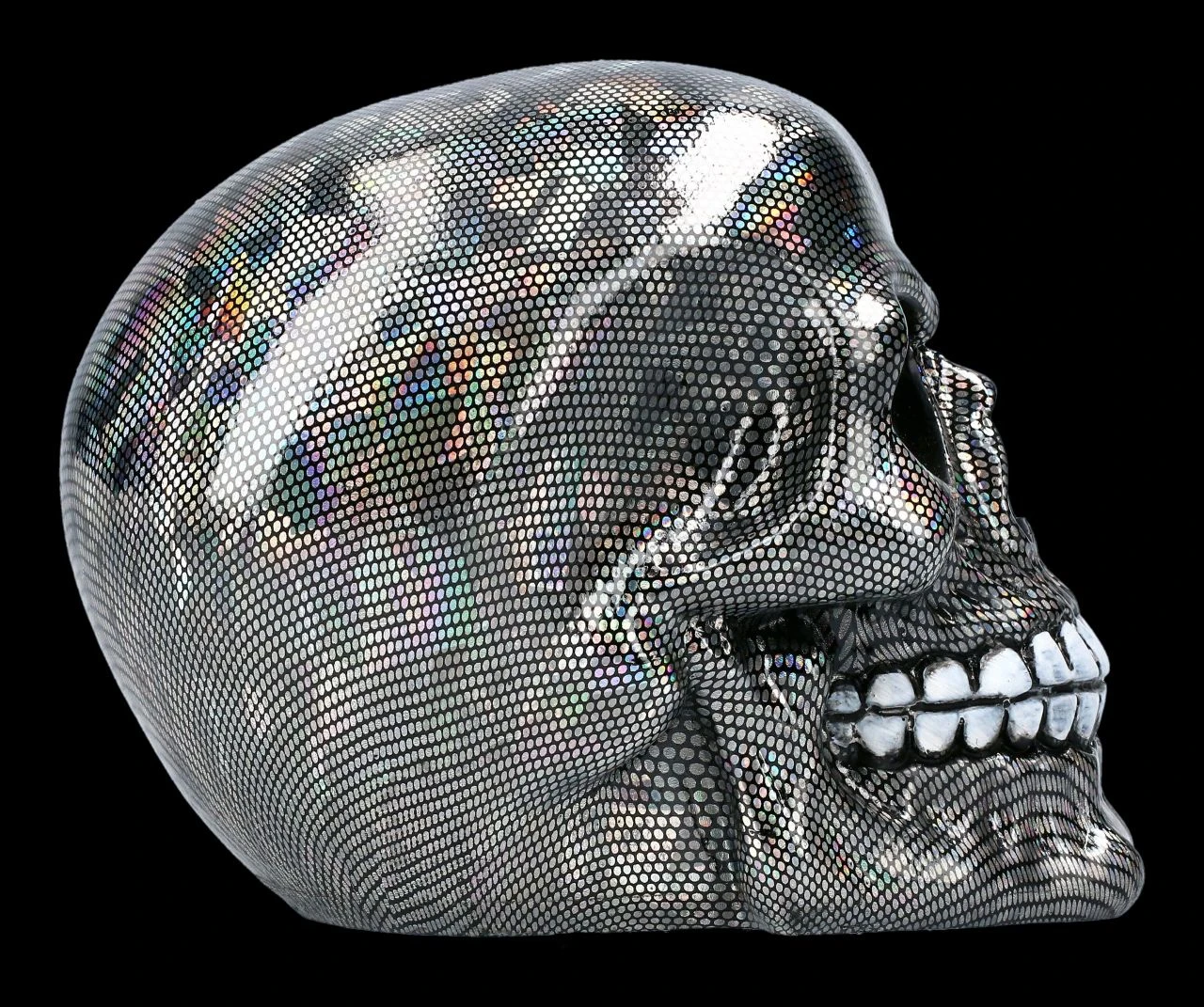 Für jeden der es liebt, seine Wohnung mit außergewöhnlichen Accessoires zu dekorieren, ist dieser Totenkopf ein absolutes Must Have. Das holographische Muster dieses Schädels sorgt zusätzlich für Aufmerksamkeit. Der Totenkopf aus Kunststein (Polyresin) ist außerordentlich detailreich handbemalt. Er ist 12 cm hoch, 11 cm breit und 15,5 cm tief und ein toller Blickfang auf jedem Schreibtisch, Sideboard oder im Regal.