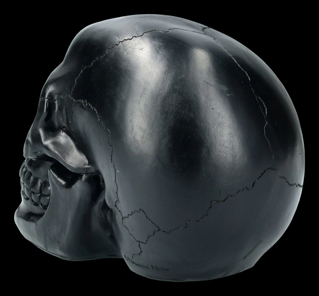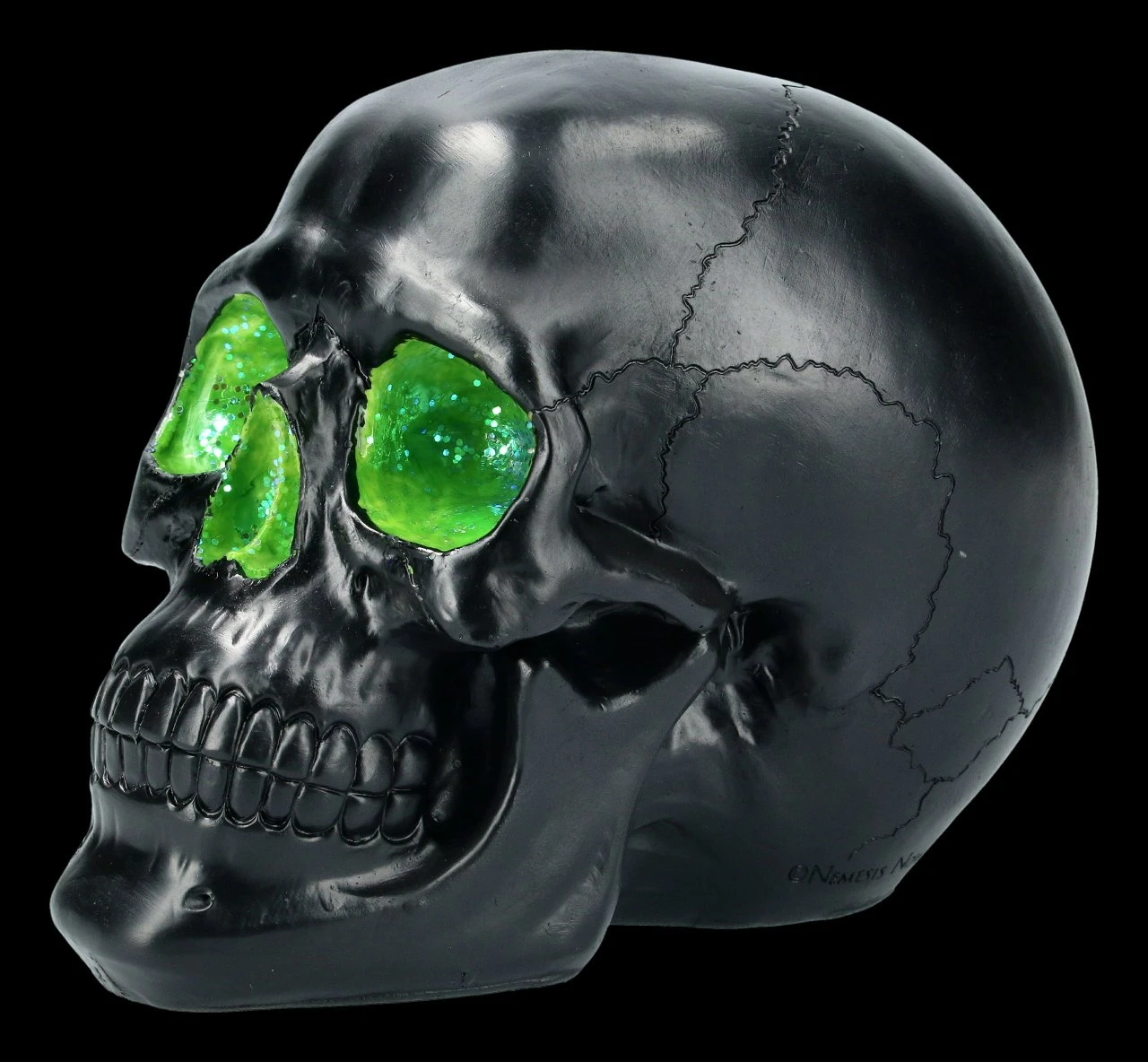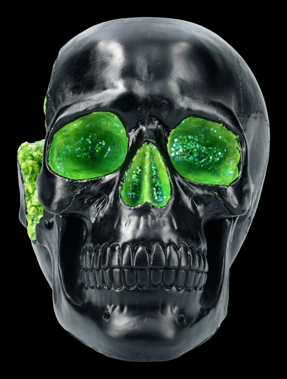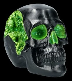 Magisch funkeln grüne Kristalle aus den Augenhöhlen, der Nasenhöhle und der rechten Schläfe des schwarzen Schädels. Der Geode Skull ist aus detailliert handbemaltem Kunststein (Polyresin) gefertigt und 14 cm hoch, 12 cm breit und 19 cm tief. Schlicht und klar ist dieser Schädel eine coole Deko für Ihren Schreibtisch.