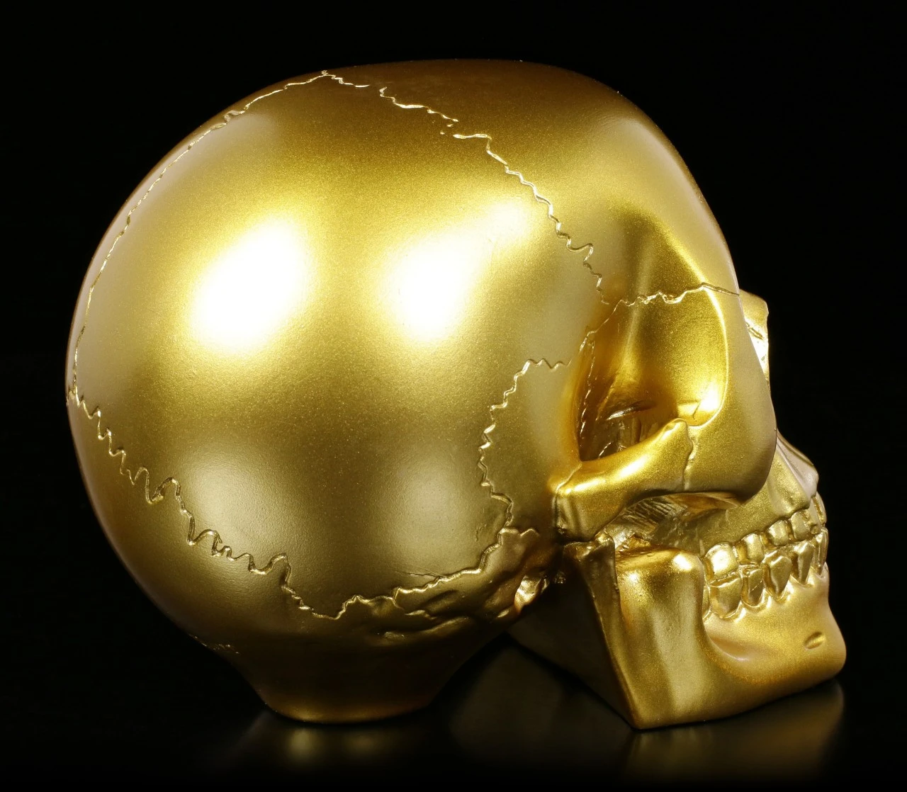 Wer ist noch auf der Suche nach DEM Schädel schlecht hin? Wie ein glänzender Goldbarren wirkt der Totenkopf aus handbemaltem Kunststein (Polyresin). Ob er wohl zu einem antiken Schatz gehört? Wurde er angebetet? Egal was die Geschichte hinter dem Goldenen Totenkopf ist, einen Blick ist er allemal wert.