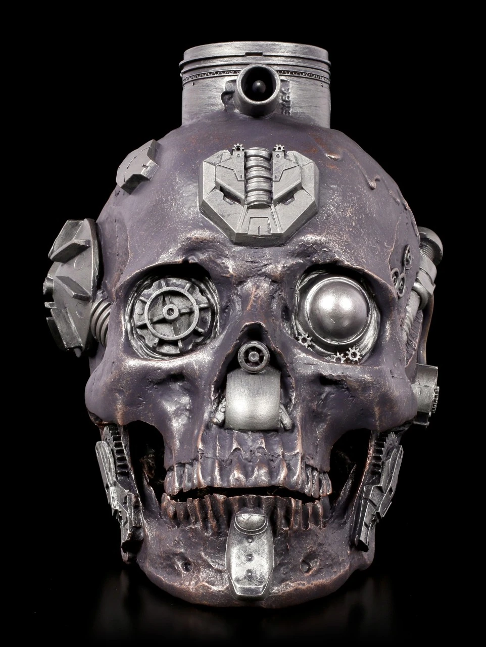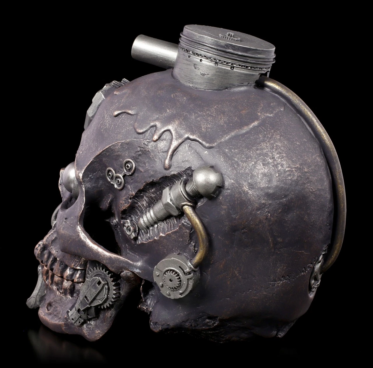 Mensch, Maschine, Waffe… Der Totenkopf Maschine Skull F10 ist eine kriegerische Symbiose zwischen Panzer und Schädel. Der handbemalte Schädel aus Kunststein (Polyresin) hat zahlreiche Details einer Kriegsmaschine integriert. Wenn Sie auf der Suche einem außergewöhnlichen Totenkopf sind, ist F10 genau das Richtige für Sie.