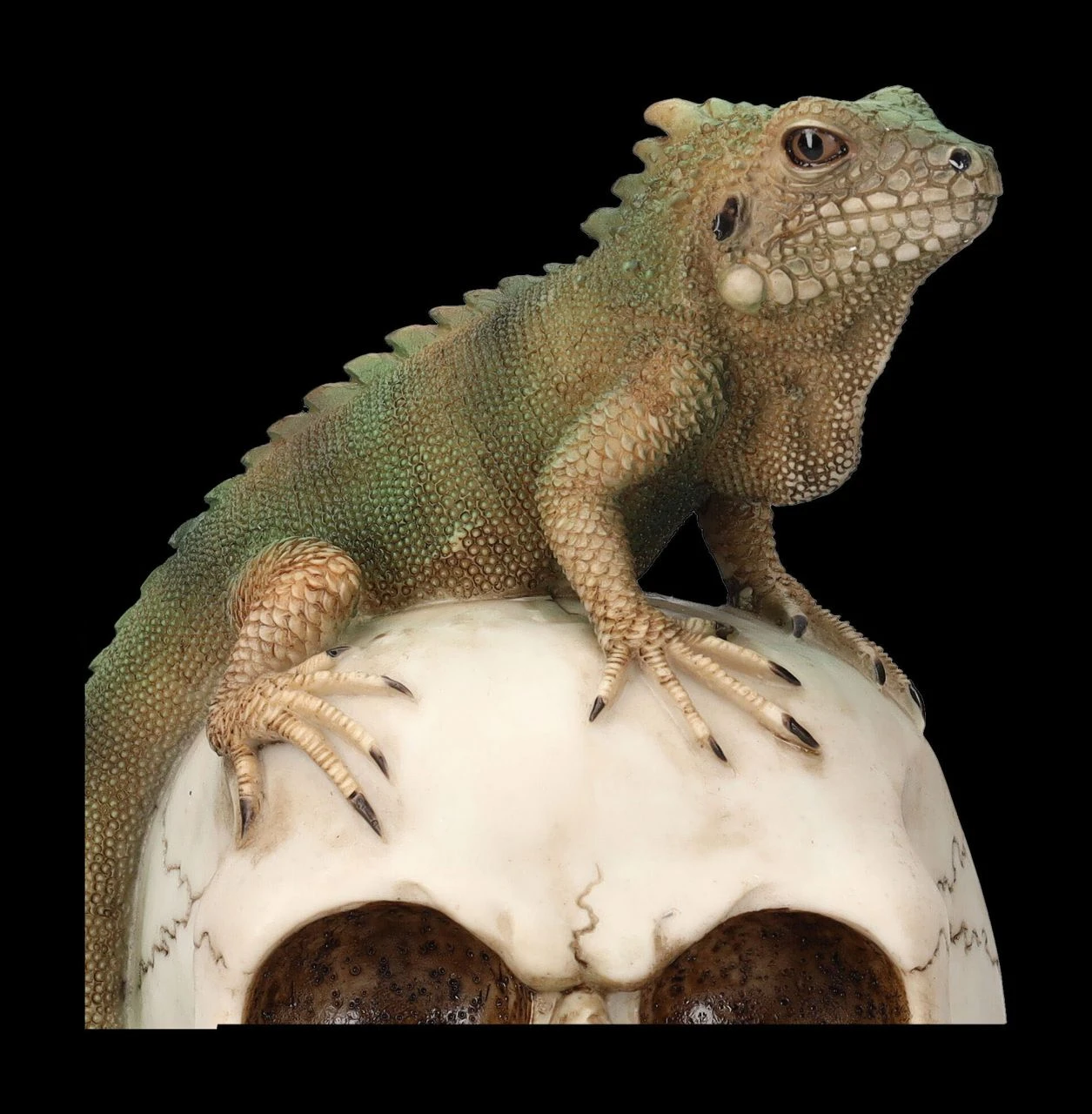 Ein Leguan nutzt offenbar den grinsenden knochenfarbenen Schädel als perfekt erhöhten Ort, um die ersten wärmenden Sonnenstrahlen einzufangen. Die Dekofigur mit dem wunderbar detailreich und natürlich gestalteten Leguan auf dem Schädel wurde aus Kunststein (Polyresin) gefertigt. Der Totenkopf mit dem Leguan wurde von Hand bemalt und ist mit der Höhe von 18 cm, der Breite von 12 cm und der Tiefe von 15 cm ein toller Blickfang für jeden Schreibtisch. Schädel-Sammler werden sich aber auch über das coole Geschenk freuen