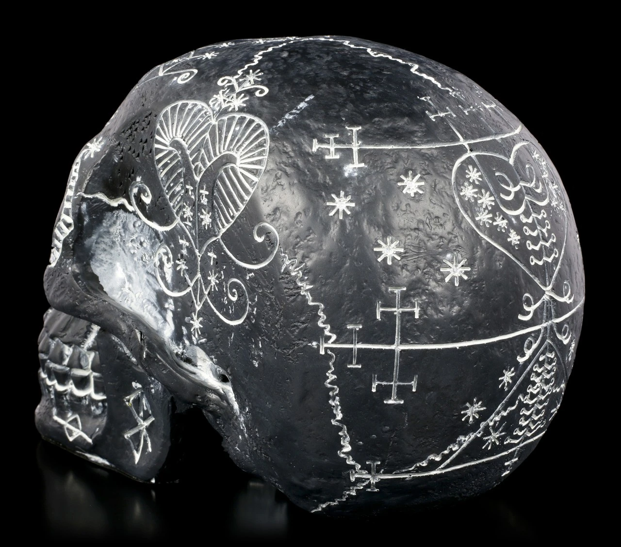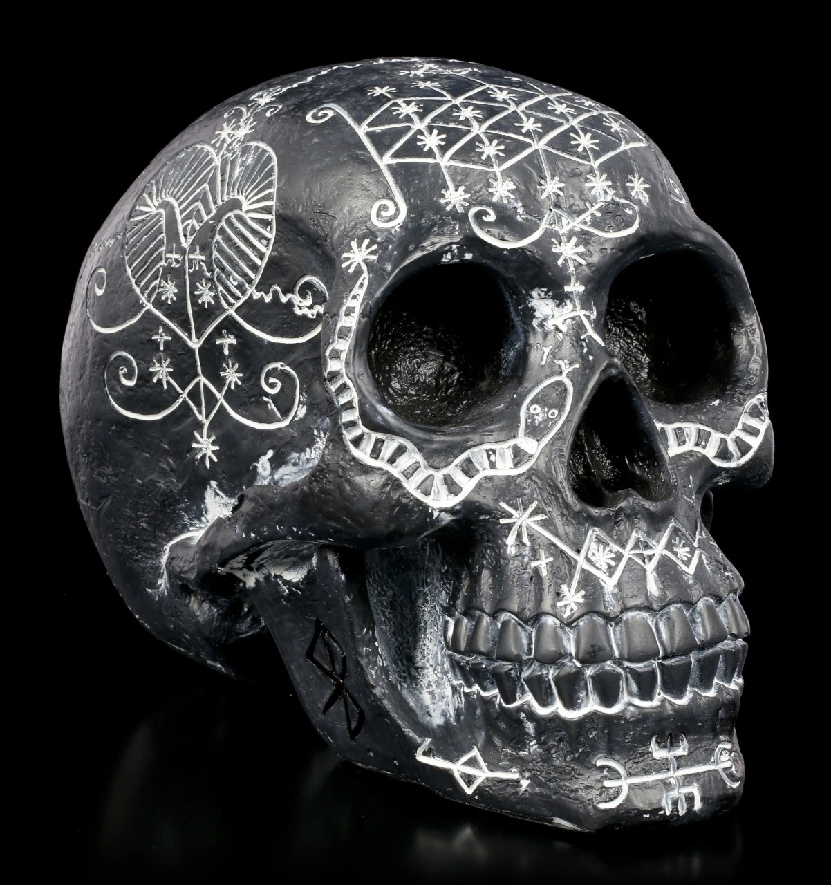 Der schwarze Totenschädel wirkt durch die weißen mystischen Symbole höchst geheimnisvoll. Was die wohl bedeuten? Der Totenkopf aus handbemaltem Kunststein (Polyresin) ist ein stilvolles Dekorationselement – nicht nur für Halloween.