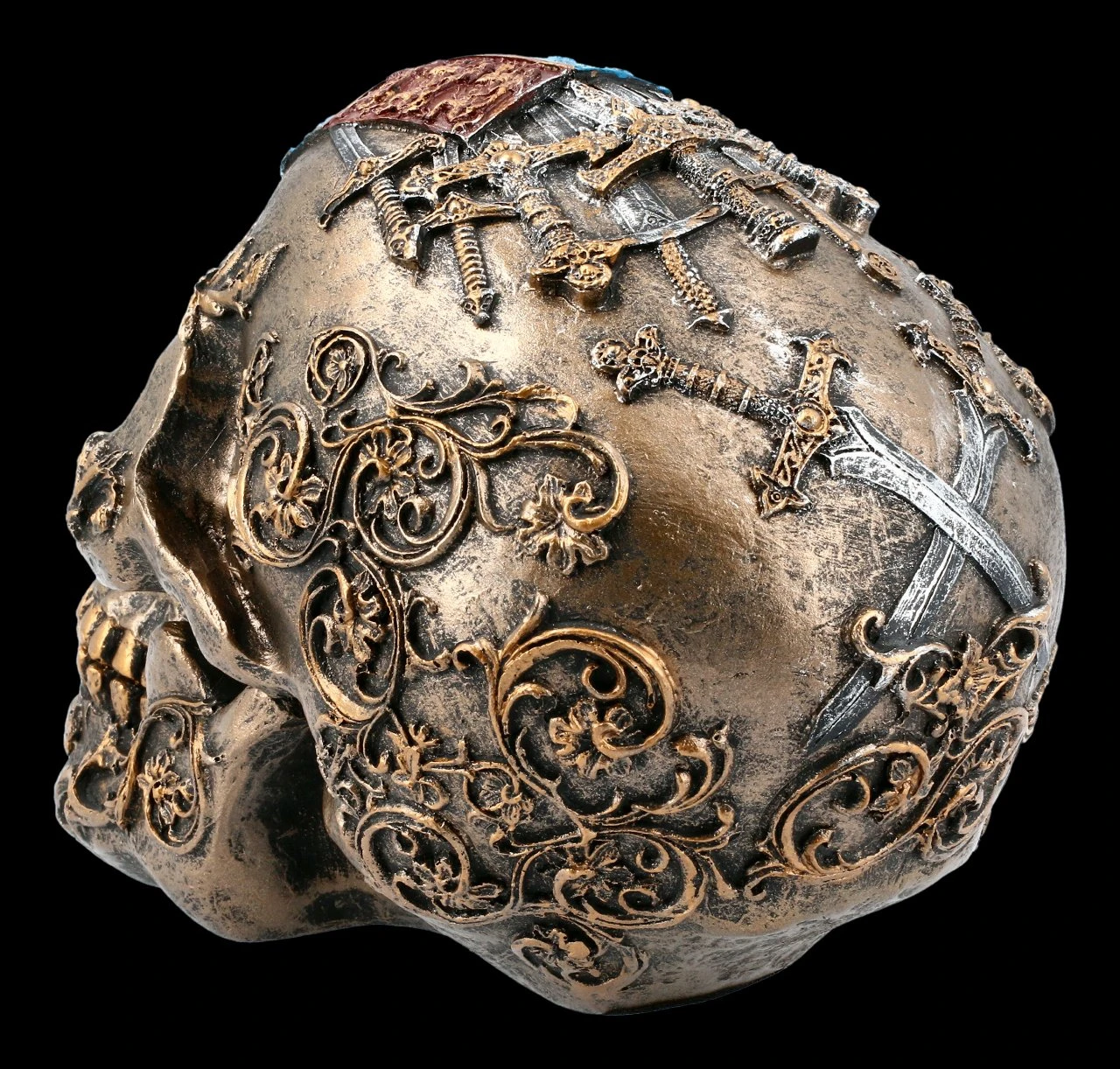 Der mit filigranen Ornamenten und einem rot-blauen Wappen verzierte Totenschädel ist nicht nur für Mittelalter Begeisterte ein Must Have. Der handbemalte Schädel aus Kunststein (Polyresin) ist eine tolle Ergänzung zu jeder Totenkopf Sammlung