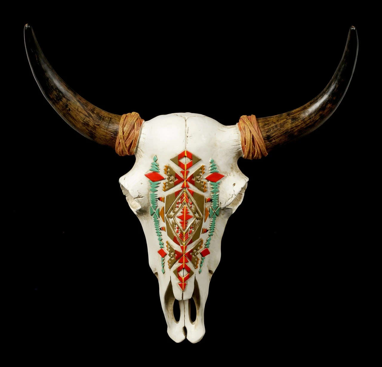 Der handbemalte Büffel Schädel aus Kunststein (Polyresin) ist mit bunten indianischen Mustern verziert und eine wunderbare Wanddeko für jeden Western Fan. Der Schädel kann zu dekorativen Zwecken auch auf ein Sideboard gelegt werden und besticht durch die vielen Details.