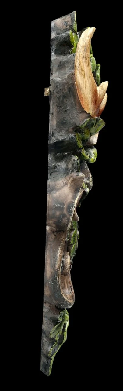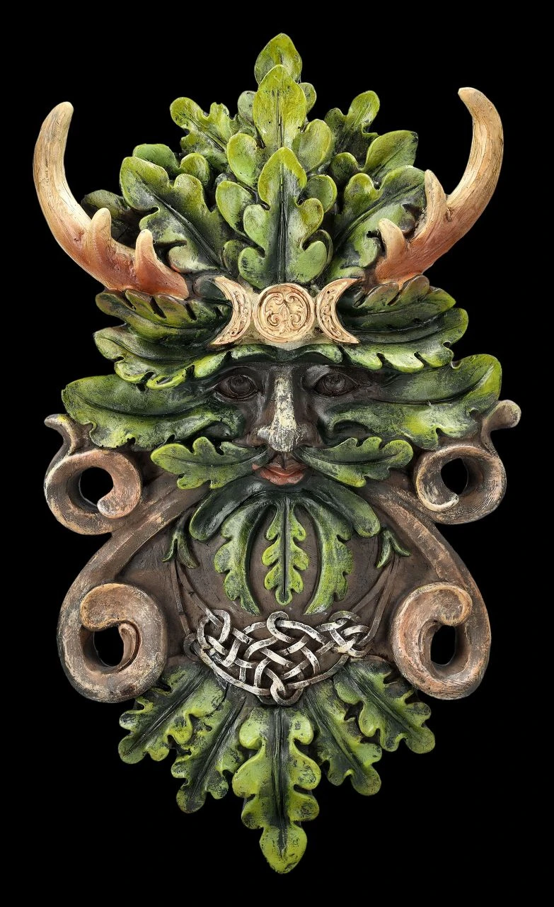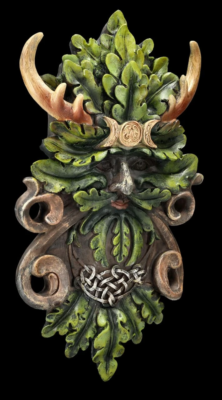 Dass der Greenman auch bei den Kelten zu den Vegetationsgöttern gehörte, ist diesem Wandrelief anzusehen. Das mit zahlreichen grünen Blättern umrandete Gesciht wurde bereits in vorchristlicher Zeit oft als spirituelles Symbol für das Werden und Vergehen in der Natur dargestellt. Auch in der mittelalterlichen Kunst, wie z.B. auf alten Kirchen, findet man immer wieder die Darstellung des ‚Grünen Mannes‘ oft auch als ‚gehörnten Naturgott‘, wie bei diesem 29,5 cm hohen, 16,5 cm breiten und 4 cm tiefen Wandrelief zum Hängen. Es wurde aus handbemaltem Kunststein (Polyresin) gefertigt und zeigt das rätselhafte und symbolhafte Wesen mit Hörnern, dem Symbol der Dreifachen Mondgöttin auf der Stirn und einem keltischen Muster auf dem Kinn. Das Wandrelief ist auch ein perfektes Geschenk für alle Anhänger des ‚Grünen Mannes‘, aber auch für alle, die von der Wicca-Spiritualität der dreifachen Mondgöttin überzeugt sind.