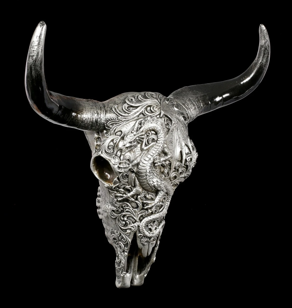 Sind Sie auf der Suche nach einer ungewöhnlichen Wanddeko? Dann ist der silberfarbene Stierschädel aus handbemaltem Kunststein (Polyresin) perfekt für Sie! Der Schädel mit Drachenmotiv lässt sich auch dekorativ auf einem Sideboard platzieren.